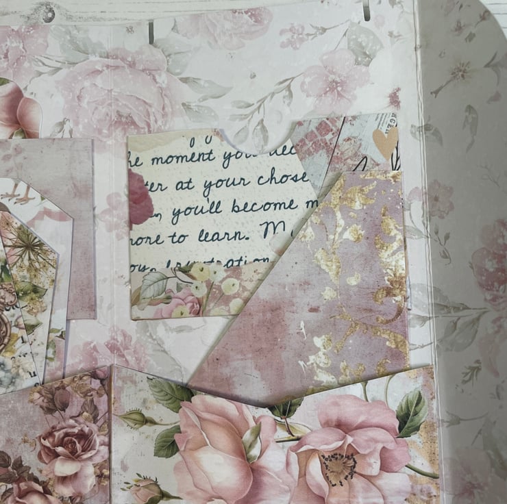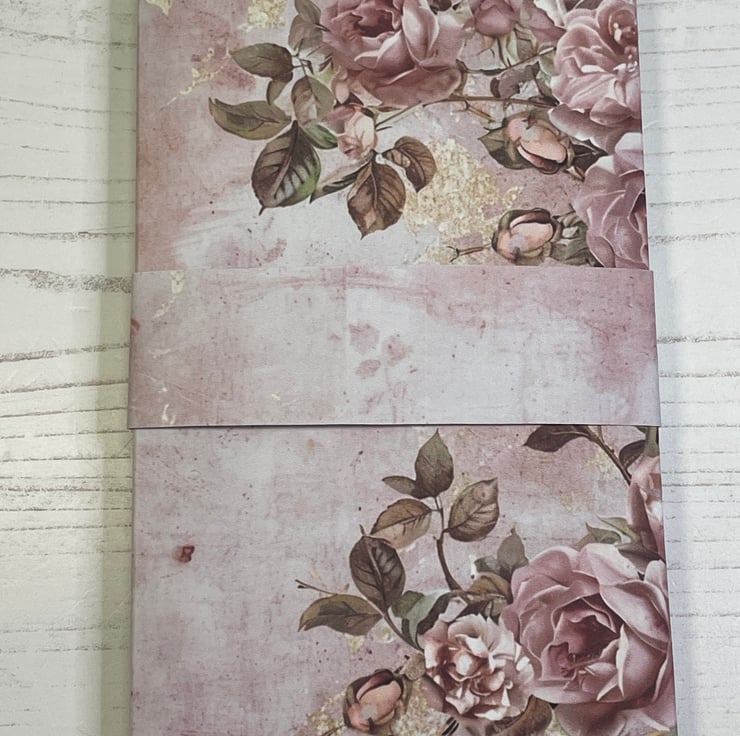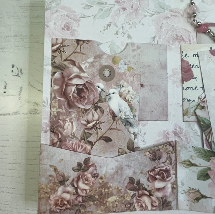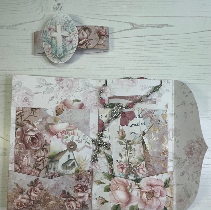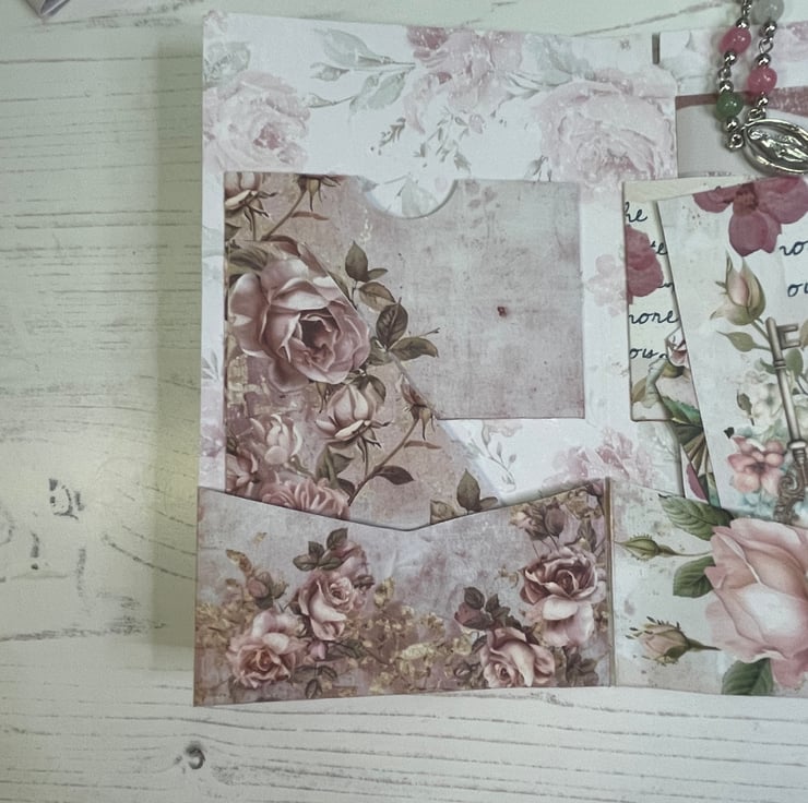 Beautiful rose faith flip folio with pockets, tags and cards. A pretty glass bead decade small rosary with charm of Our Lady and decorative Crucifix.