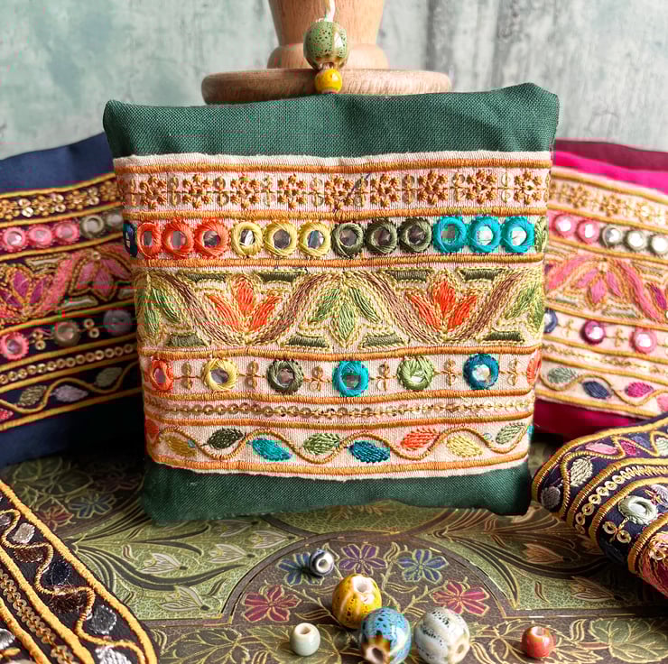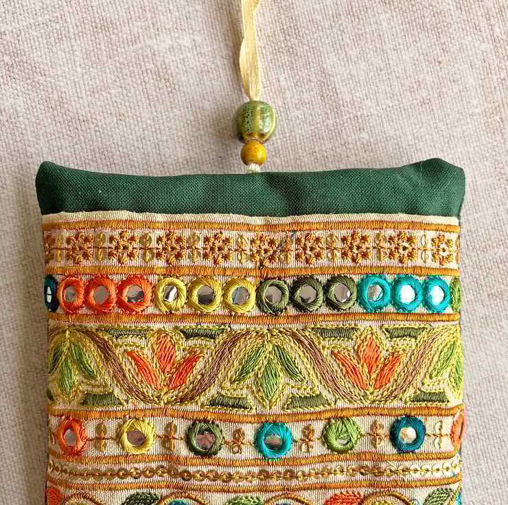The lavender bag has been filled with dried lavender from Provence. It's decorated with a section of embroidered Indian trim which I've hand stitched onto cotton fabric. I've used batik fabric for the reverse and added a couple of ceramic beads to the hanging loop.