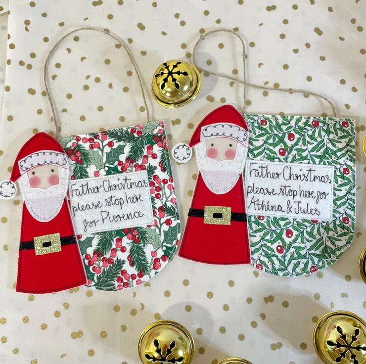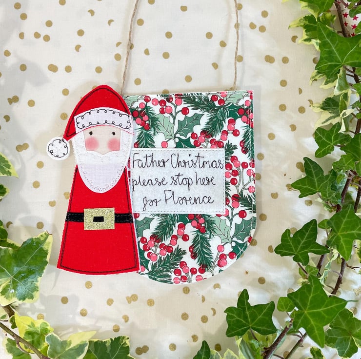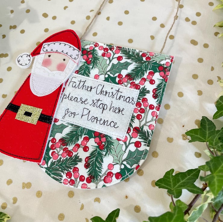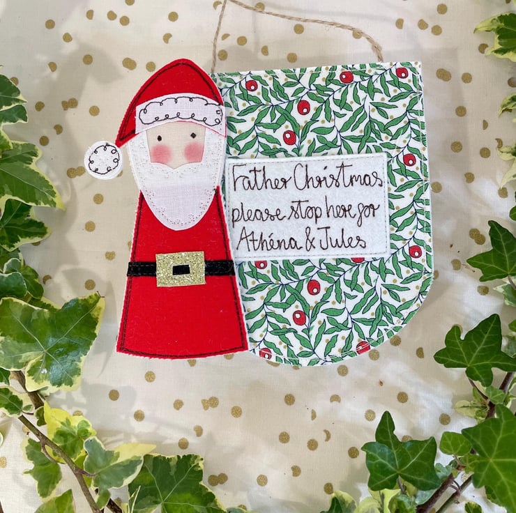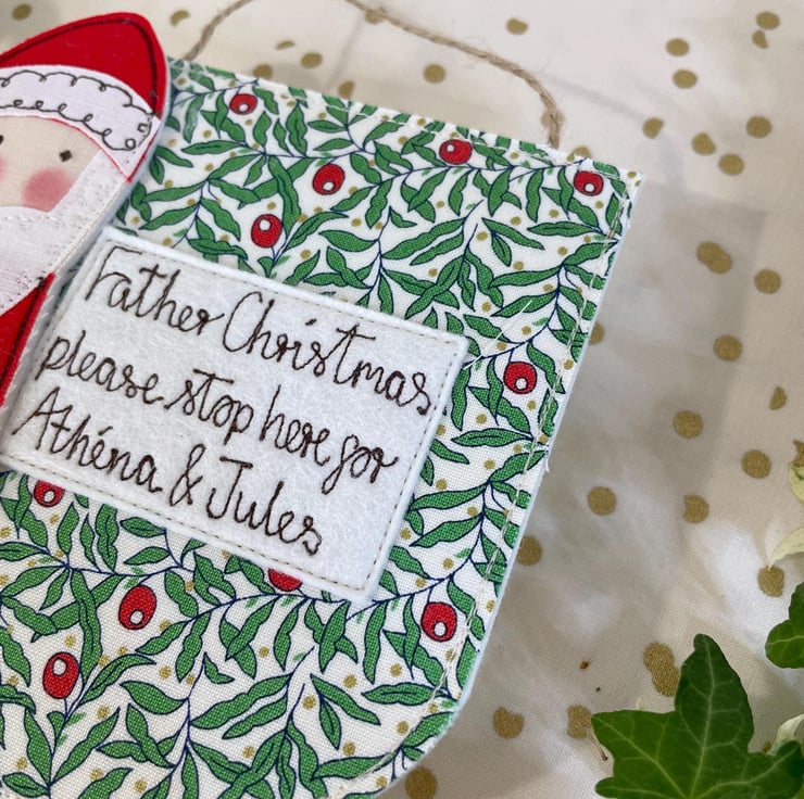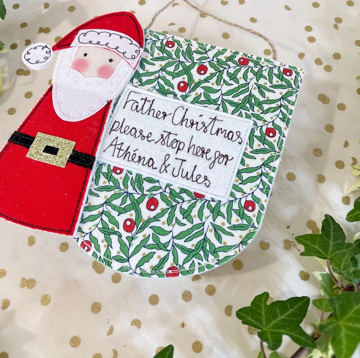 The free motion embroidered words read either Father Christmas please stop here for or 'Santa please stop here for' with the addition of a name -