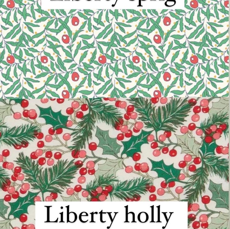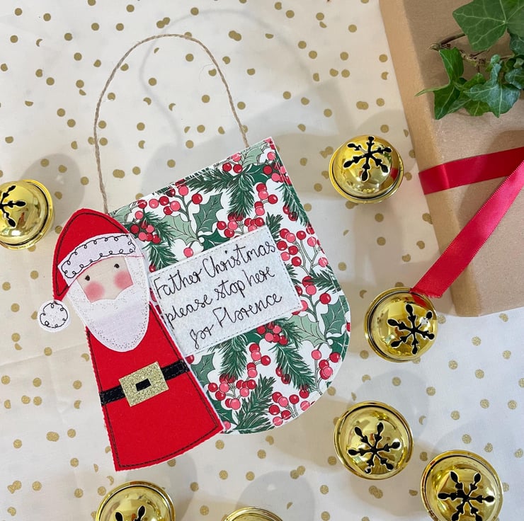 I have free motion embroidered a little Father Christmas, complete with rosy cheeks onto a flag in a beautiful Liberty sprig print cotton fabric or Liberty holly print cotton.
