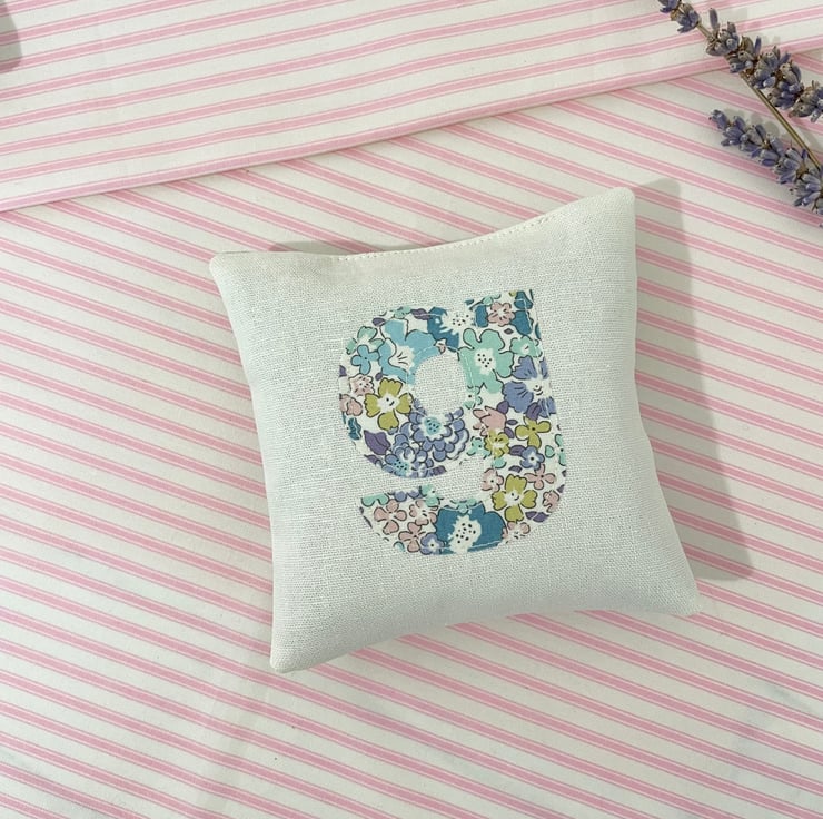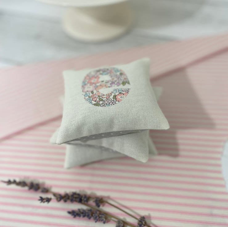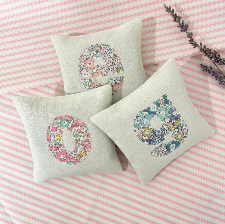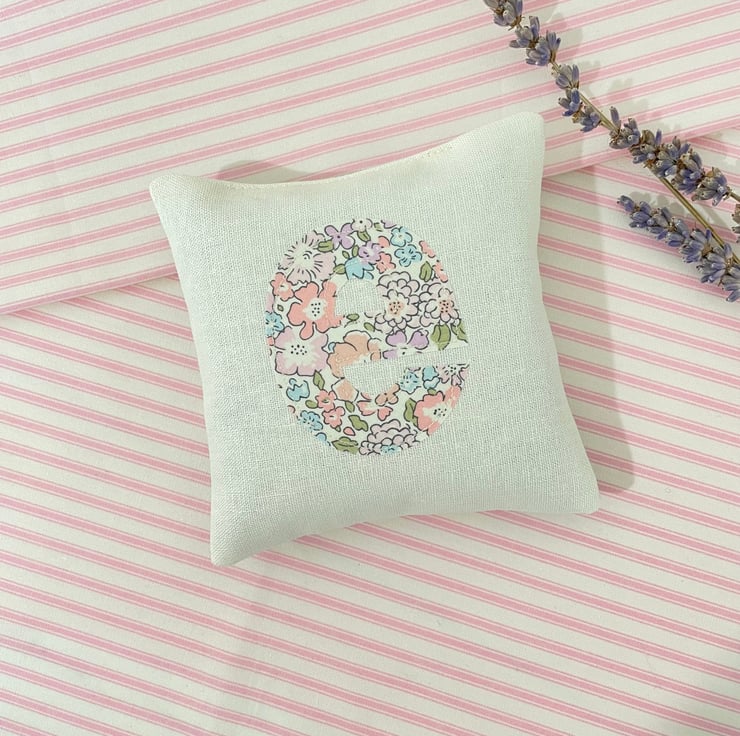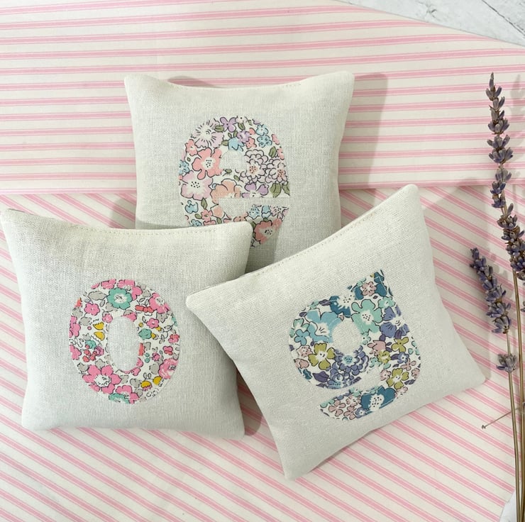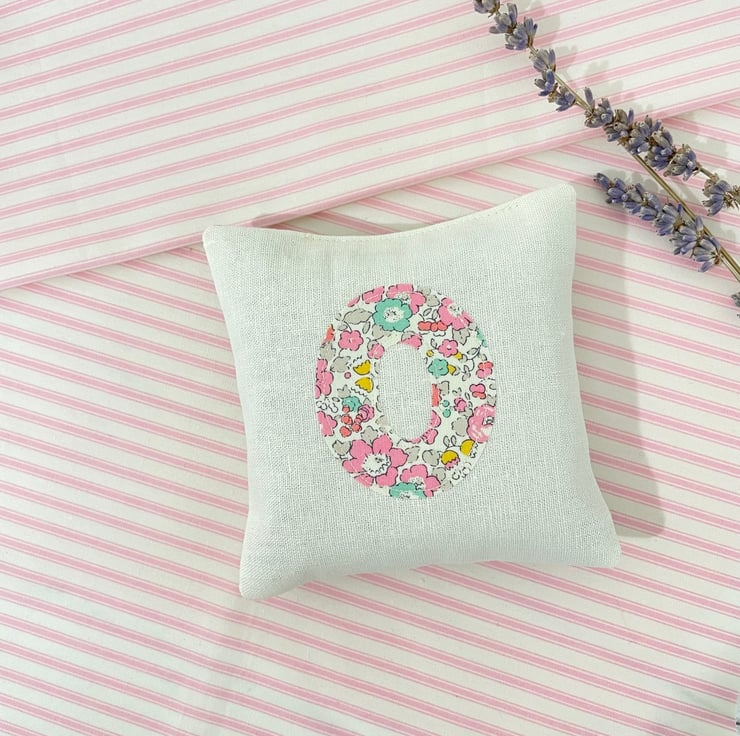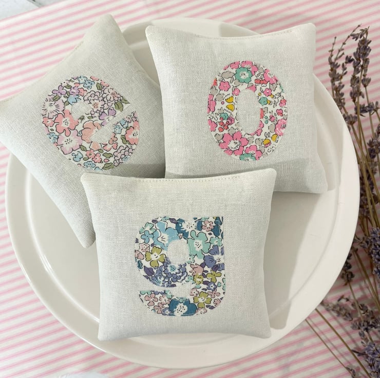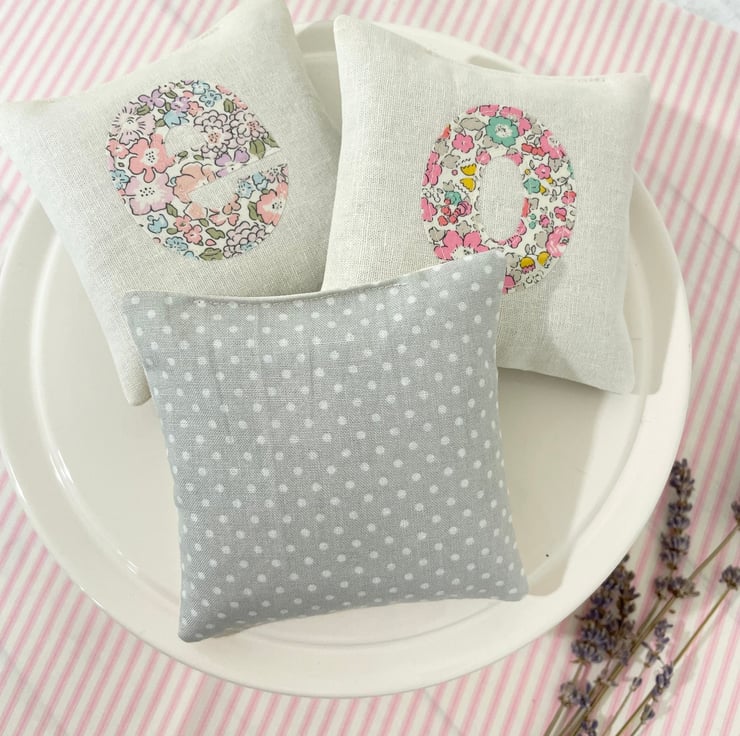 I have made a sweet lavender sachet which is to be personalised, using free motion embroidery, with an initial of your choice. Available in a choice of beautiful Liberty fabrics on a neutral background with a lightest grey cotton polka dot reverse.
