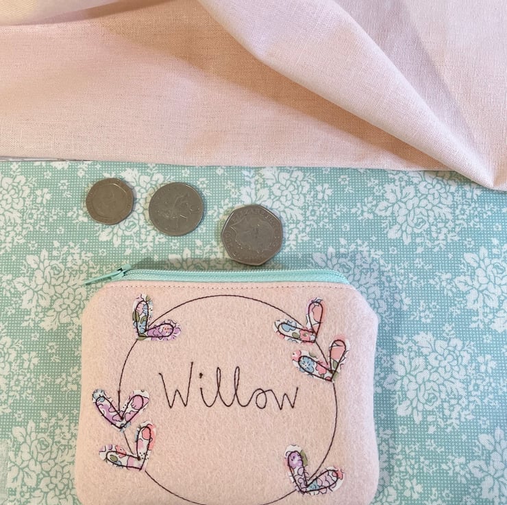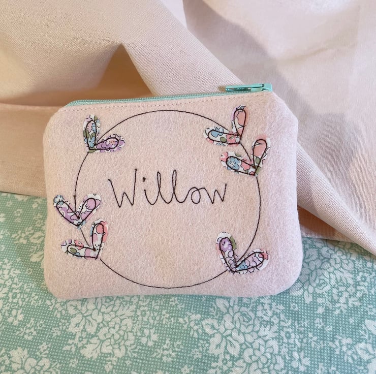 I have designed a sweet coin purse which is to be personalised with a name. In the centre is a free motion embroidered wreath and a name along with a choice of Liberty fabric leaves.