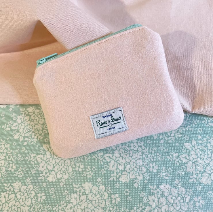 The pouch is made with lightest pink wool felt and is lined in pink Liberty cotton fabric and has a mint green zip.