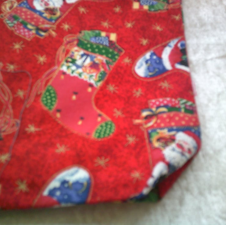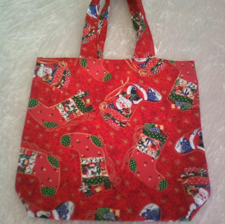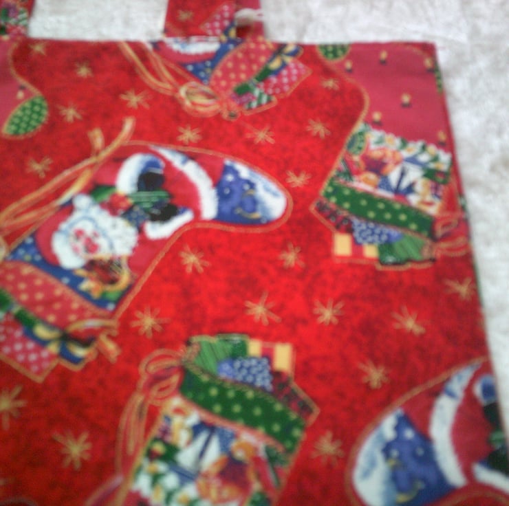 This Fabric bag is made using a 100% Cotton Fabric featuring Christmas Stockings on a red background.
