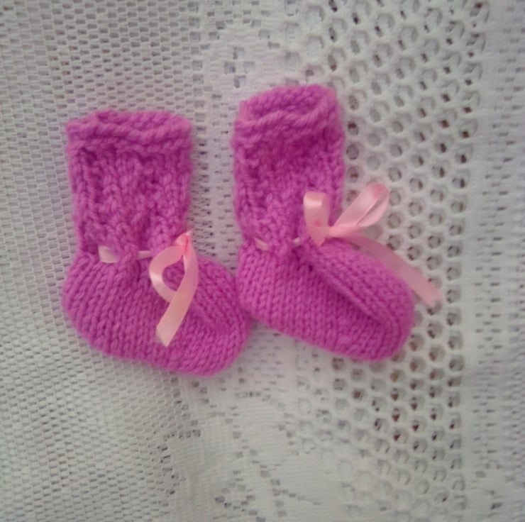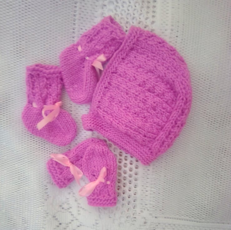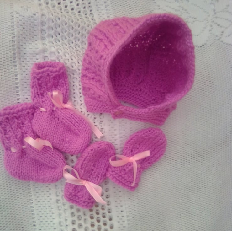 Hand knitted dress set for a baby girl comprising a Dress, Cardigan, Bonnet, Mittens & Bootees.The set is in stock in the dusky rose colour shown to fit a newborn baby with a 14 inch chest. It can also be made for you in a sizes & colour of your choice. Available sizes are shown below & please state colour required when you order. Please allow approx 1 - 2 weeks for you order to be made and posted out to you.