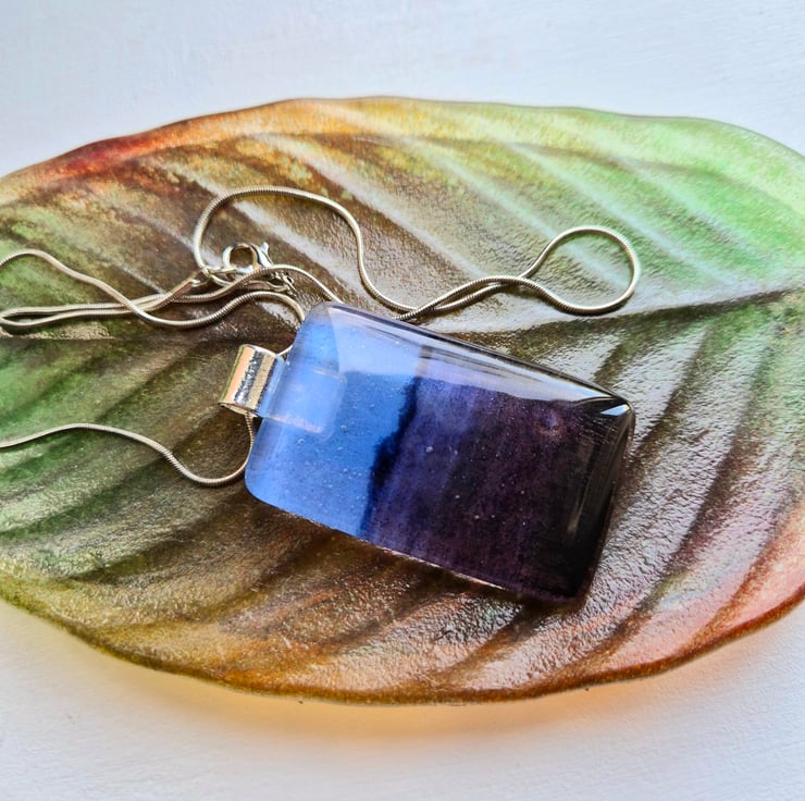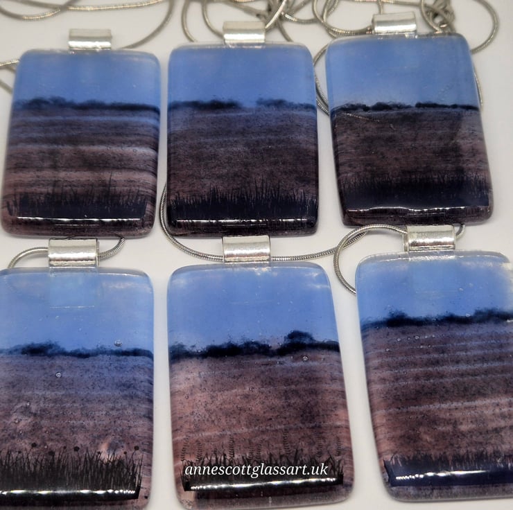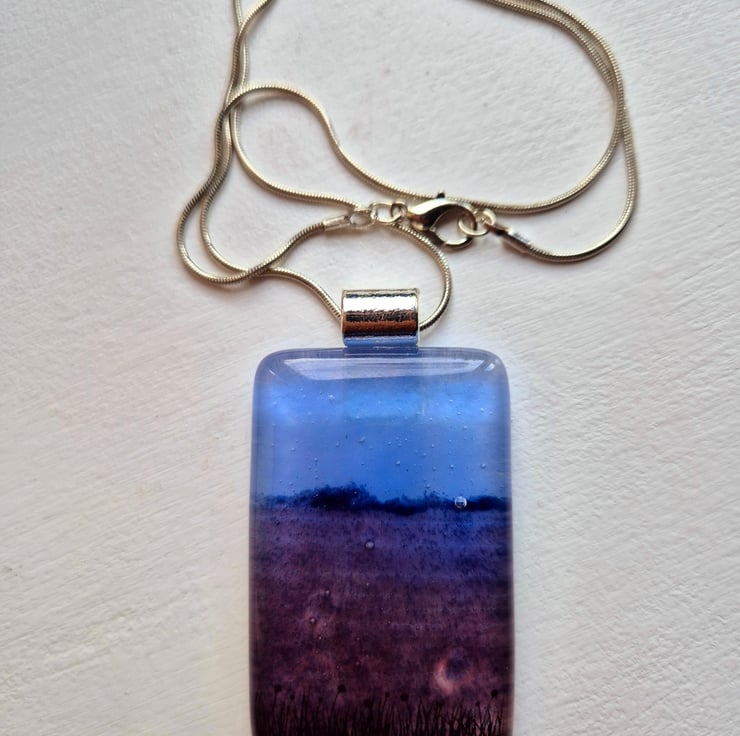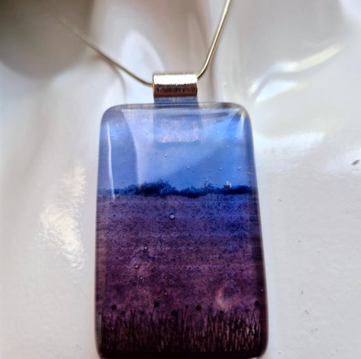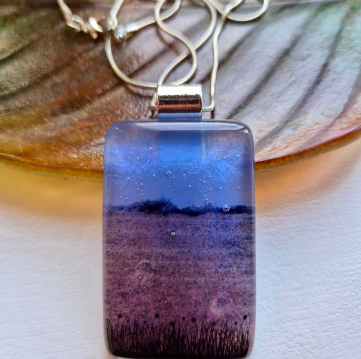 Fused glass pendant made with glass powders. This is a mini vista of a dramatic evening scheme over a meadow with long grasses and trees in the background. The pendant is 3.5cm x 5cm and 6mm thick. This comes with a silver-coloured bail and an 18-inch stainless steel snake chain. This is from a series of 5 similar mini vistas, but due to the nature of fused glass, they can never be identical