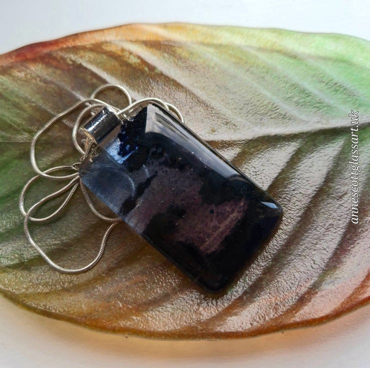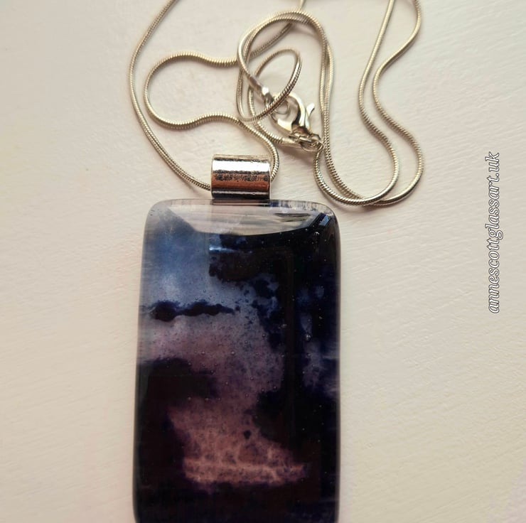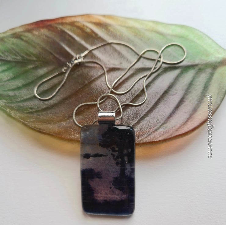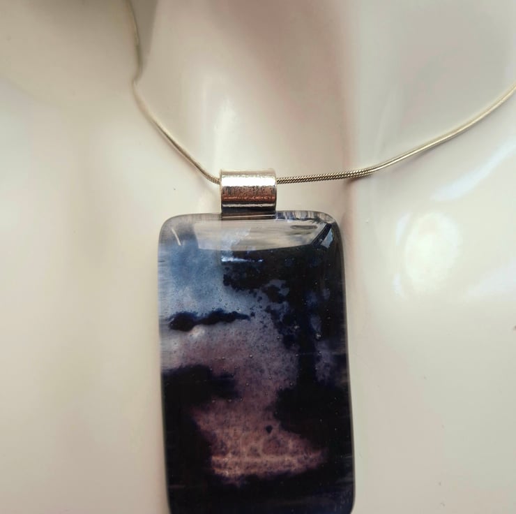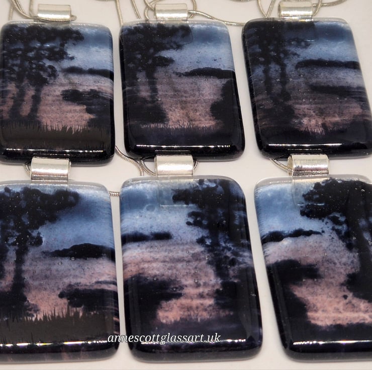 Fused glass pendant made with glass powders. This is a mini vista of a dramatic evening over the water with a riverbank and trees. The pendant is 3.5cm x 5cm and 6mm thick. This comes with a silver-coloured bail and an 18-inch stainless steel snake chain. This is from a series of 6 similar mini vistas, but they can never be identical due to the nature of fused glass.