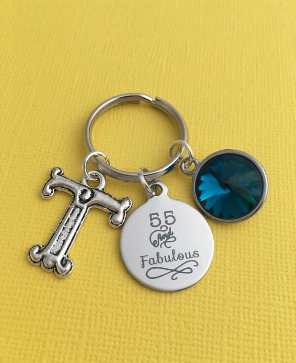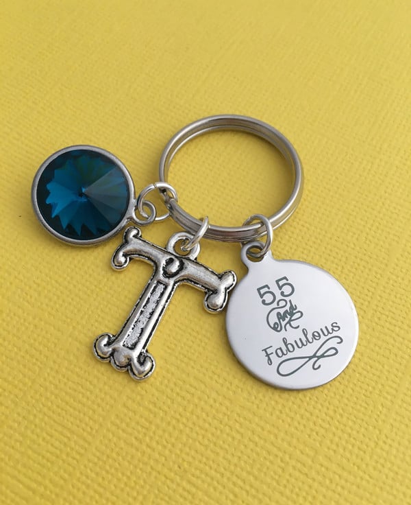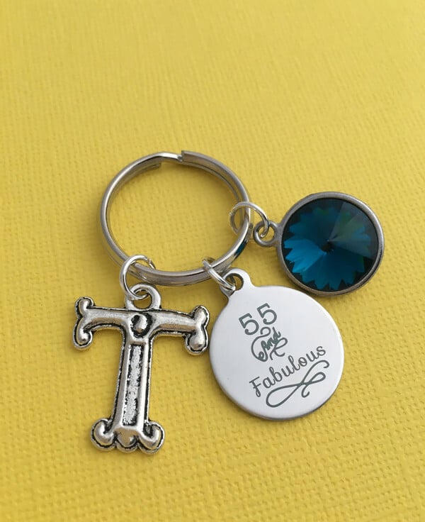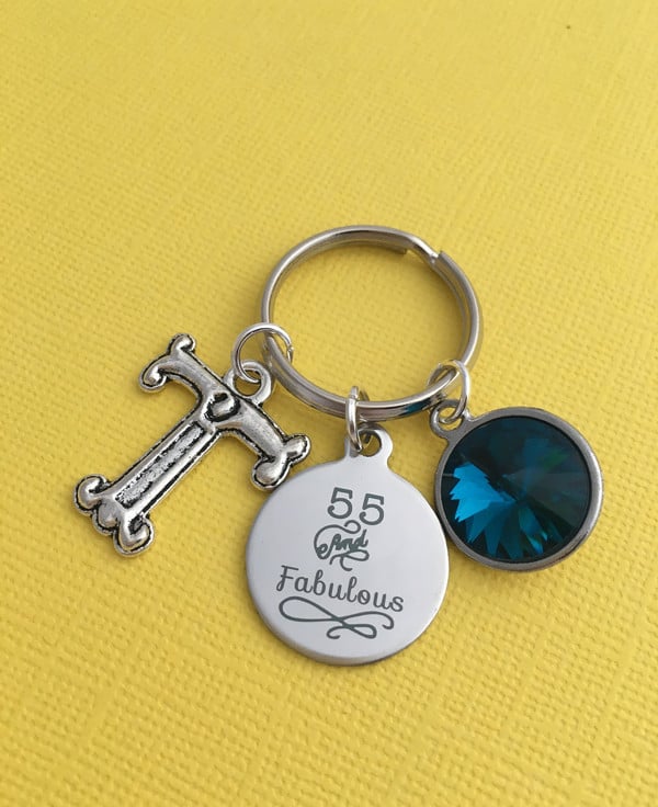 Keyring is made up of a laser engraved 55 and Fabulous stainless steel charm, large initial and birthstone of your choice