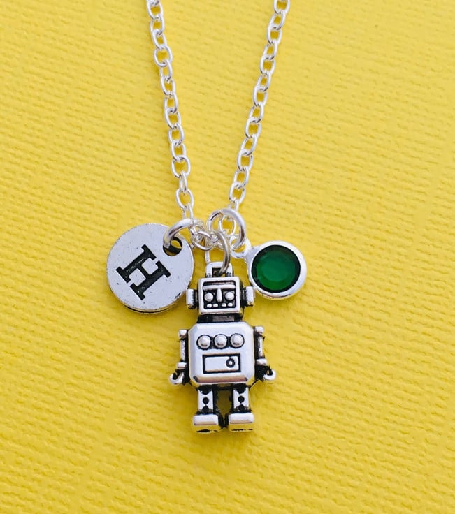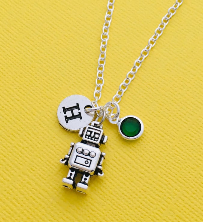 A pretty cool tibetan silver robot charm hangs alongside your required initial and birthstone charm