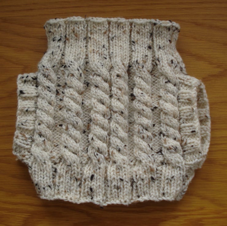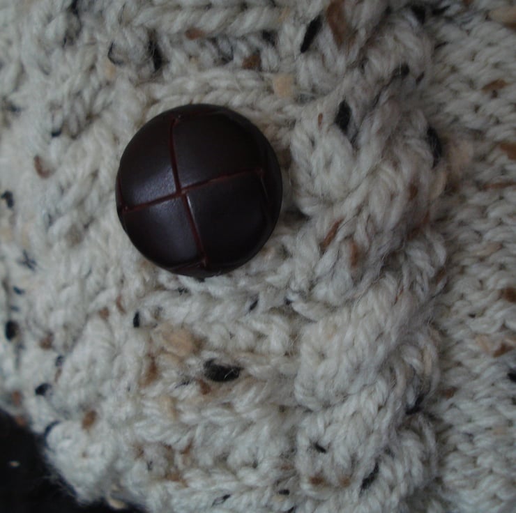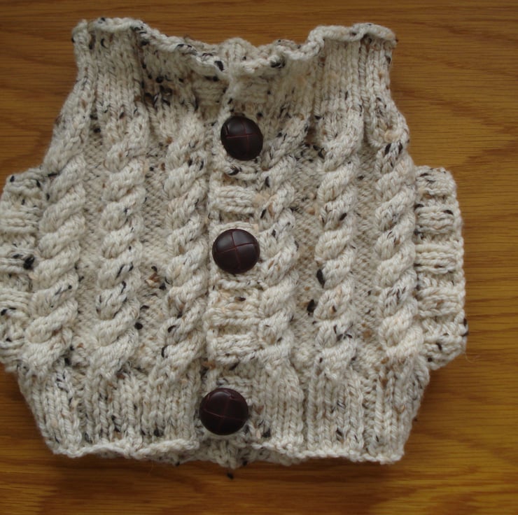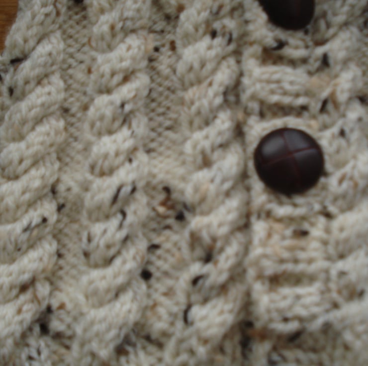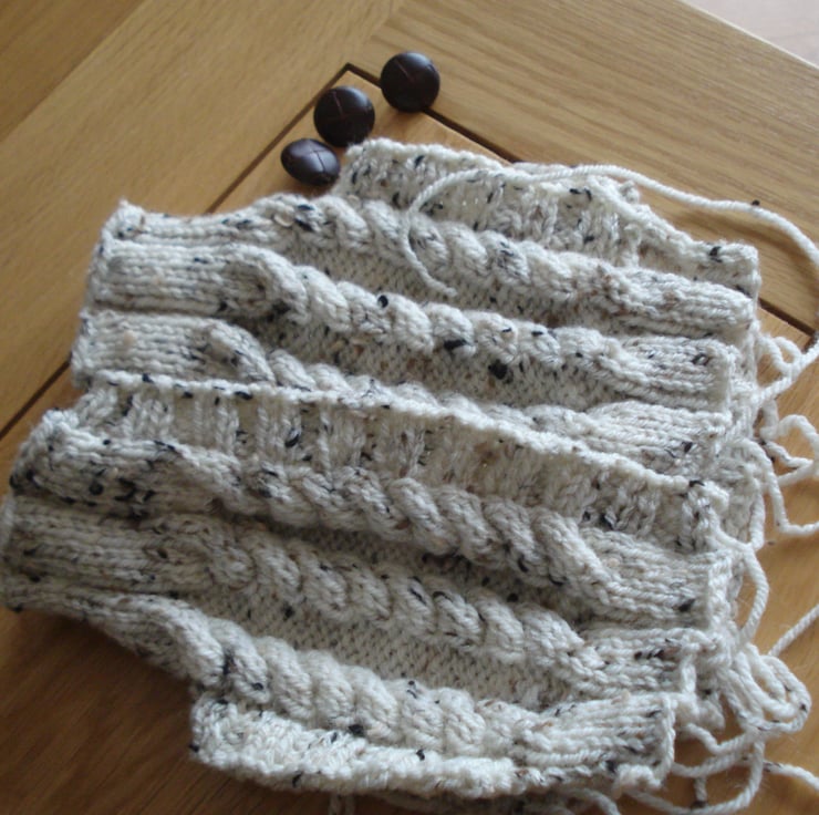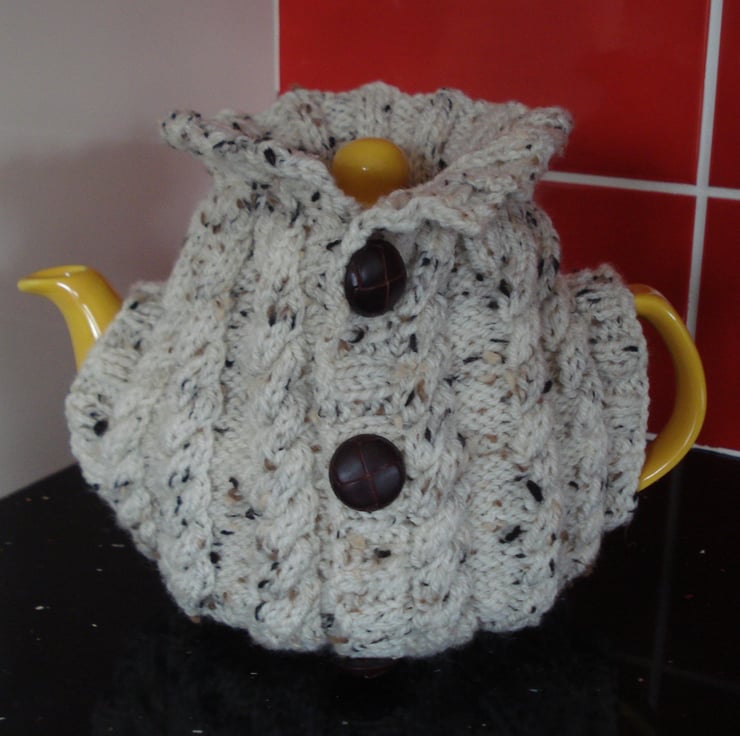 This is a generous 4 - 6 cup tea cosy jacket or jumper. The cosy is hand knitted from nice thick Aran tweed yarn and has a mock opening at the front with three dark brown plastic buttons that look like leather. Would make a great gift. I have included a picture of the item in an unfinished state as I think it is good to see the handmade element.