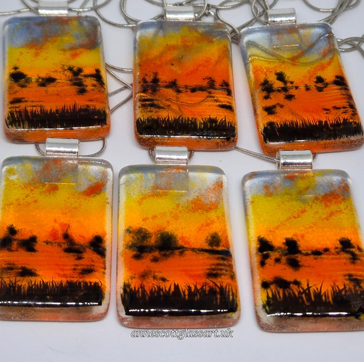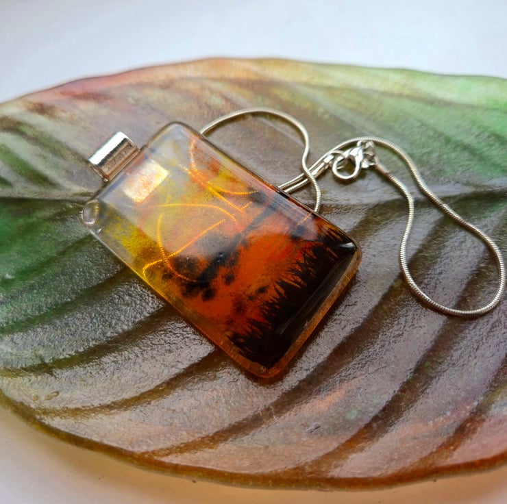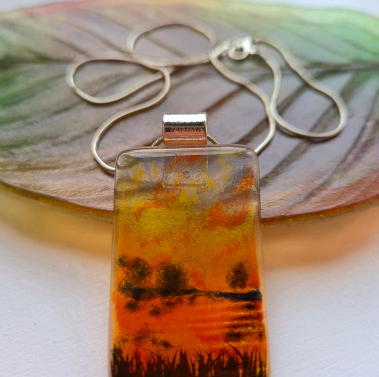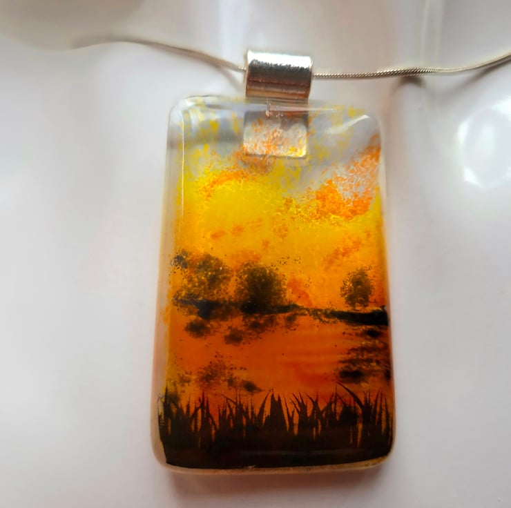 Fused glass pendant made with glass powders. This is a mini vista of a dramatic sunset scene over water with long grasses and trees. The pendant is 3.5cm x 5cm and 6mm thick. This comes with a silver-coloured bail and an 18-inch stainless steel snake chain. This is from a series of 6 similar mini vistas, but they can never be identical due to the nature of fused glass.
