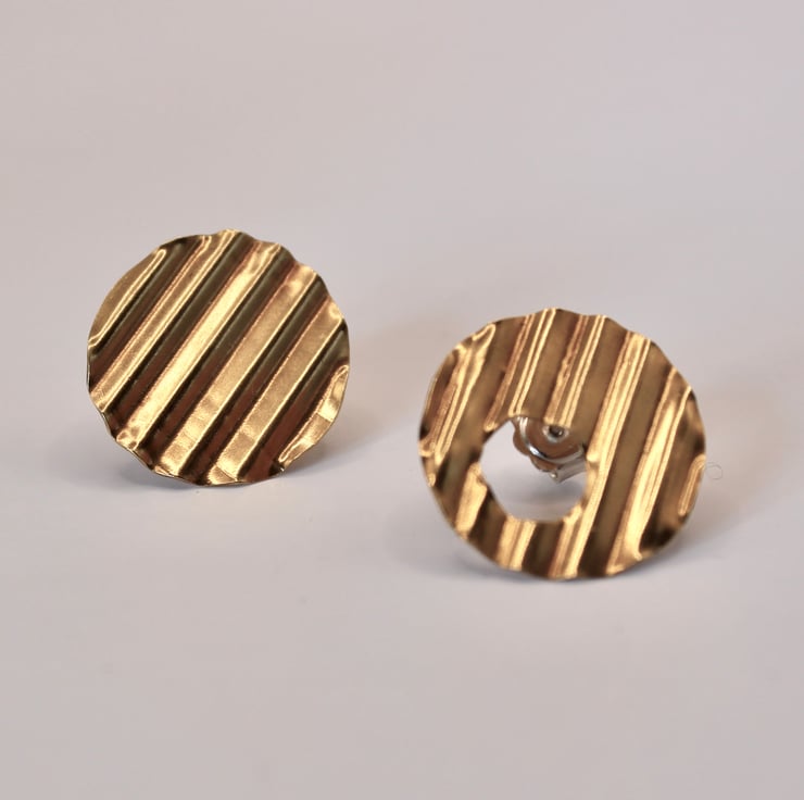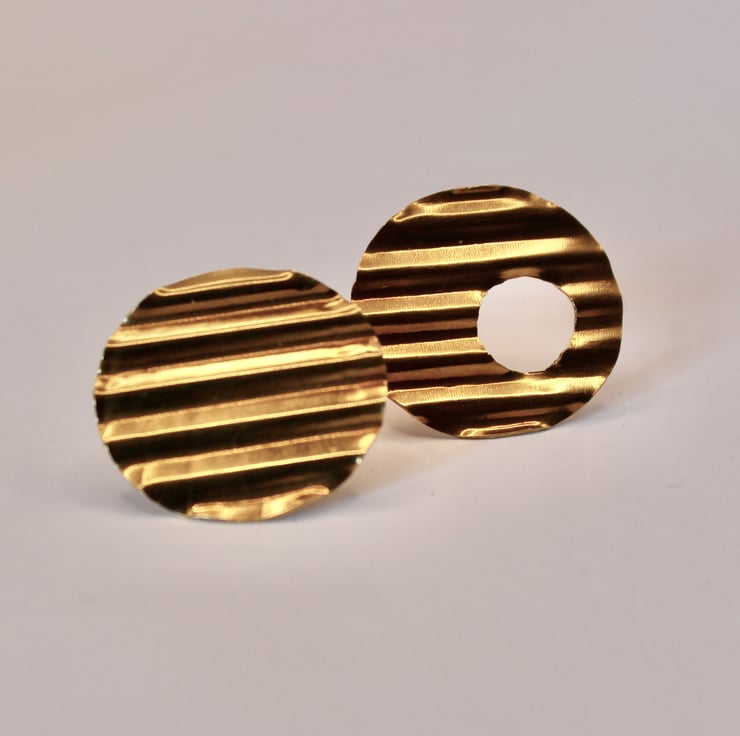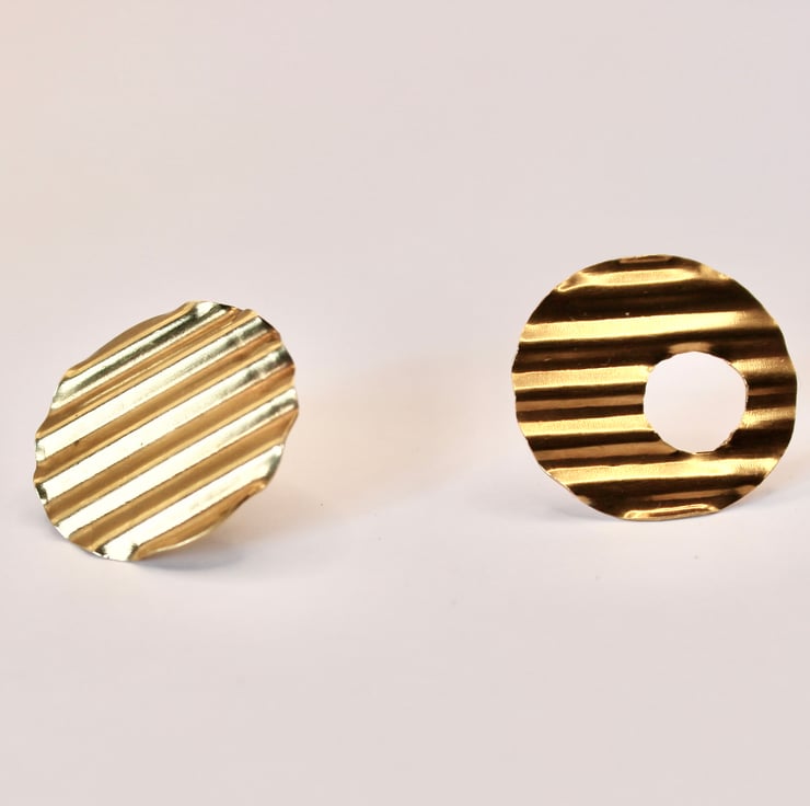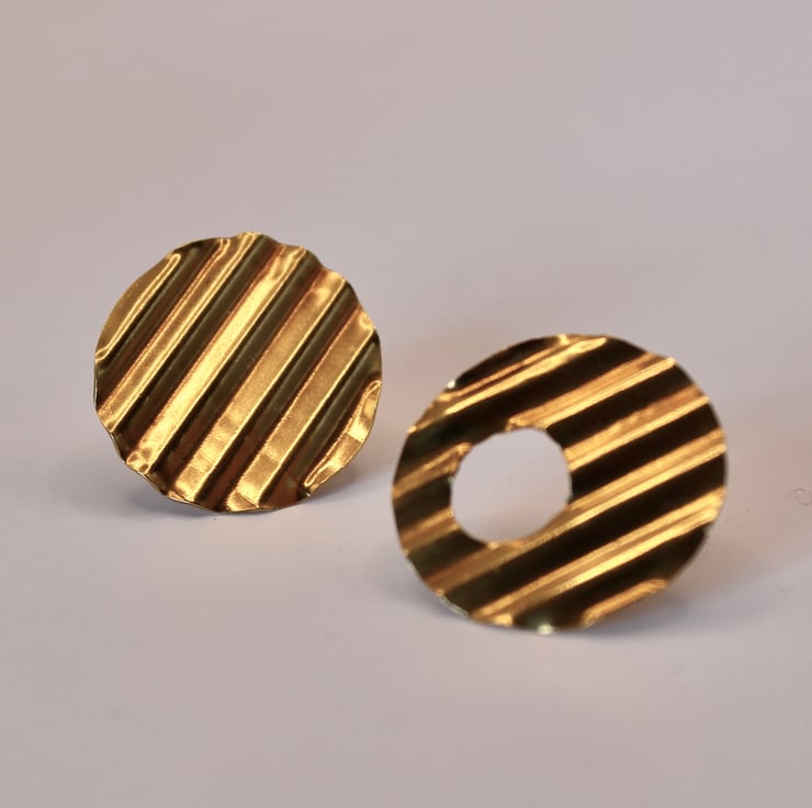 Gorgeous 22 carat gold plated silver earrings with a distinctive, crinkle design. Minimalist and elegant, the circle shaped earrings are mismatched with one made in complete circle and the other with a circle cut out of it. Add some glamour to your outfits or buy it for someone who has sophisticated tastes!