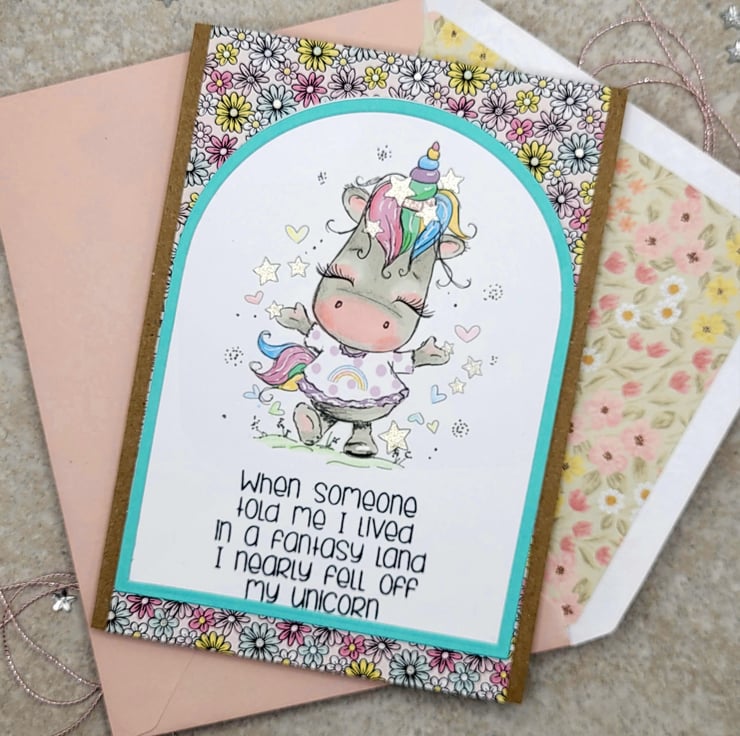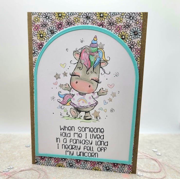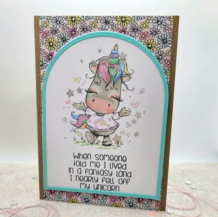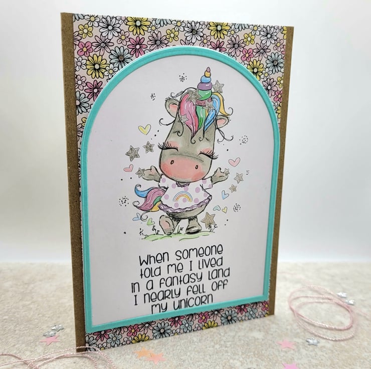The unicorn image has been coloured by hand, with artist ProMarkers for a seamless finish. There is a panel of floral design paper and a light teal paper arch frame. The fun sentiment is sure to raise a smile. Blank for own message inside the card.