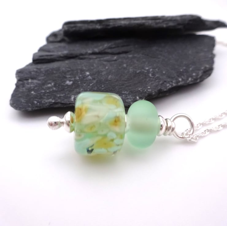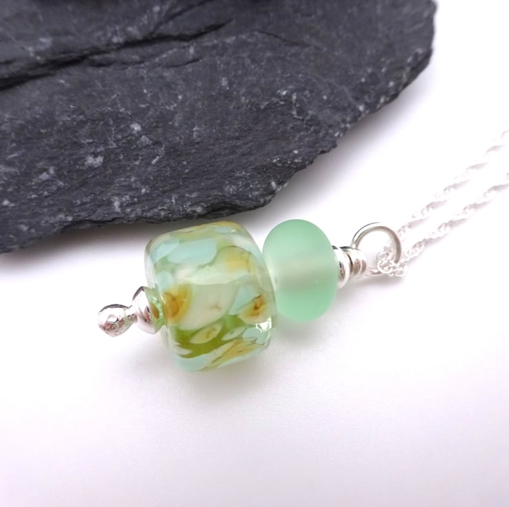 It features a handmade lampwork glass pendant strung onto a sterling silver chain.