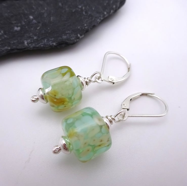 They feature sterling silver lever back ear wires and handmade lampwork pale green and brown glass beads.