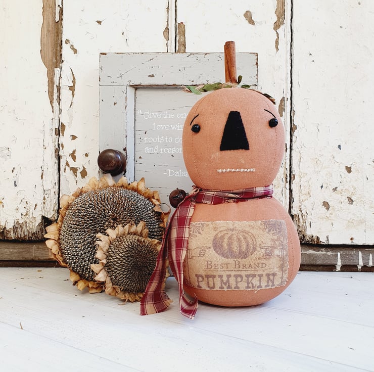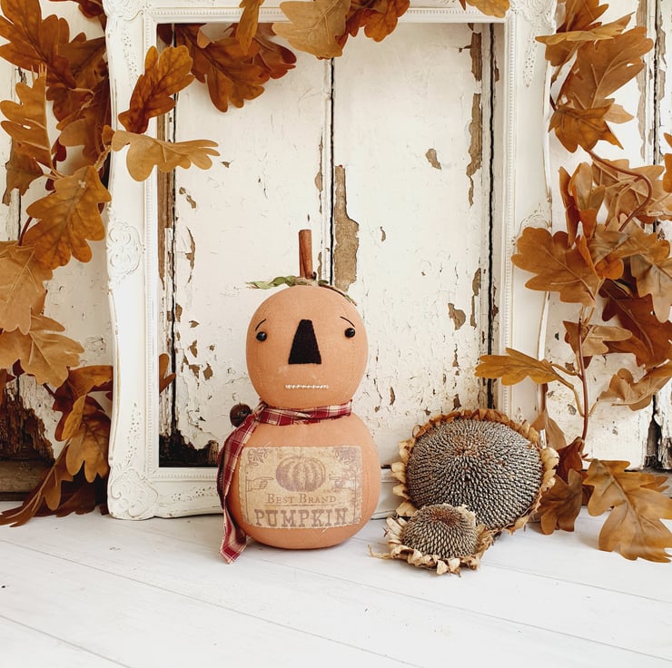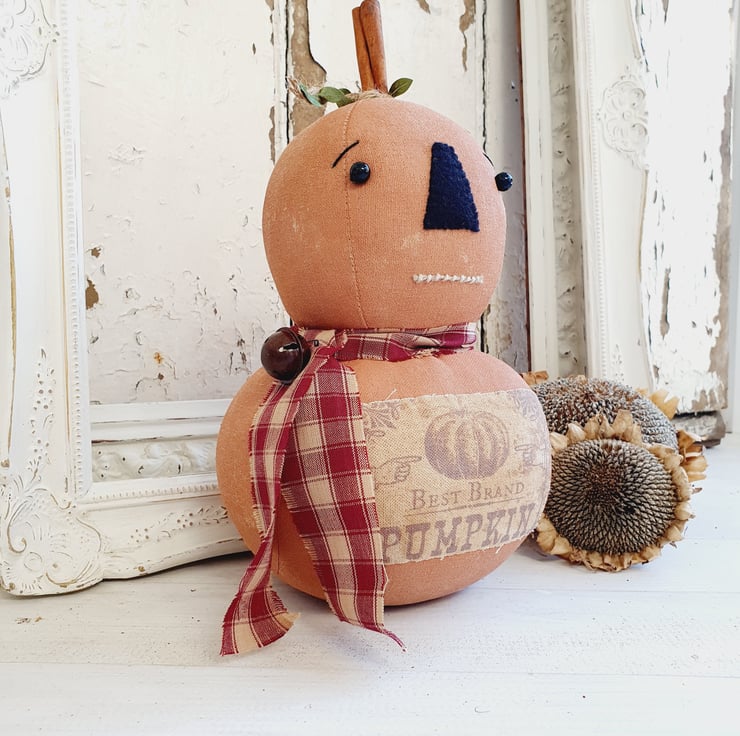 This chunky primitive pumpkin doll would make a lovely unique addition to your Autumn and Halloween decor. He has been made to look old and worn in the typical American Primitive style. I age my fabric first with coffee, cinnamon and vanilla. He has then been painted and sanded down to give him that aged, worn look. He has also been given a generous dusting of cinnamon to make him smell lovely. His face has been handstitched and a cinnamon stick has been used to make his stalk. He has been finished with a handmade ribbon tied around his neck with a little bell pinned to it and a hand printed label stitched to his front.