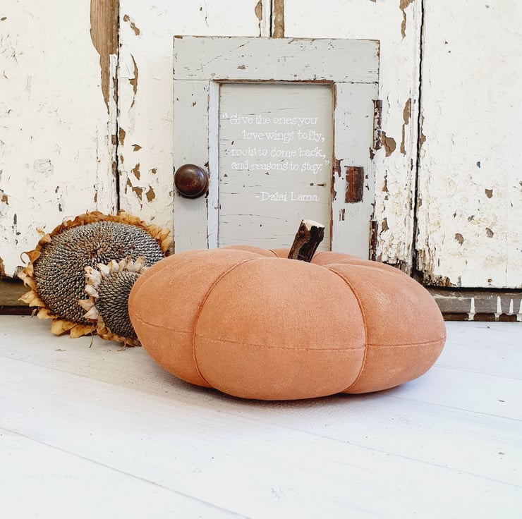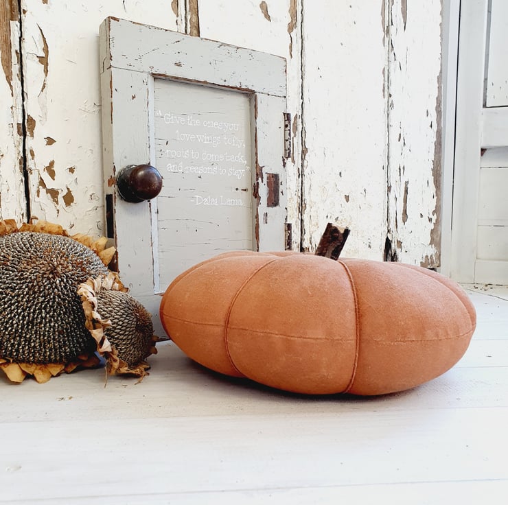 This is a full sized heirloom style pumpkin made in the American Primitive Style. It would look great as a table centrepiece for the Autumn season and Halloween and can be used year after year. The fabric has been stained with coffee, cinnamon and vanilla. It has then been painted and sanded down to give it an aged appearance. The stalk has been made from a large twig and I have then dusted it down with cinnamon to finish.