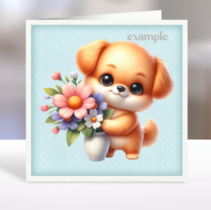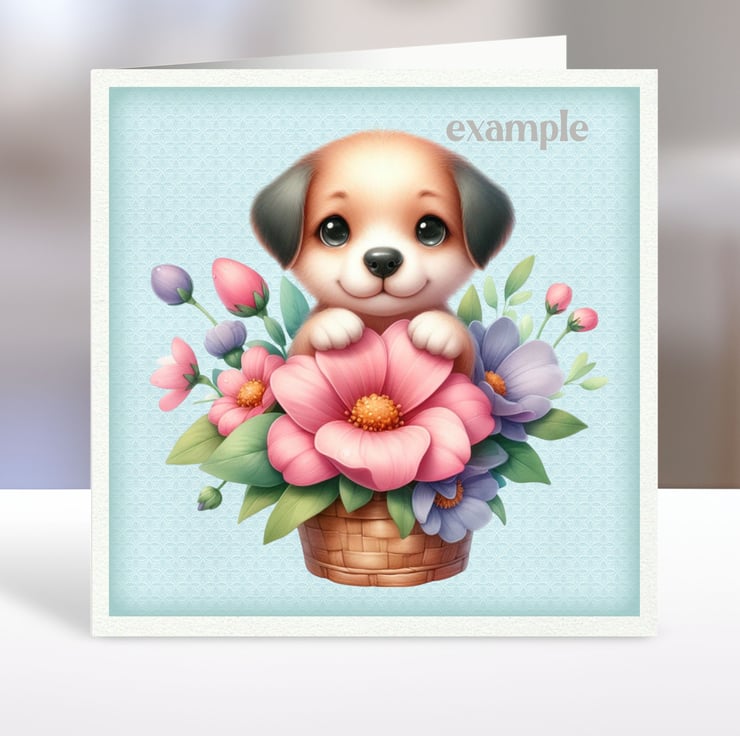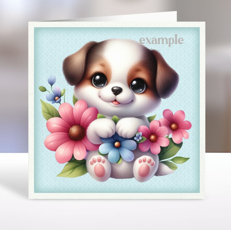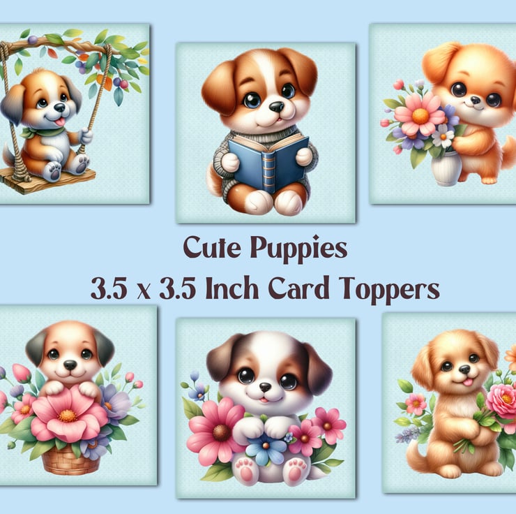 A set of six 3.5 inch square card toppers - Cute Puppies - with flowers, reading, on a swing etc. Ideal for all kinds of cards and occasions, note cards, and gift tags.
