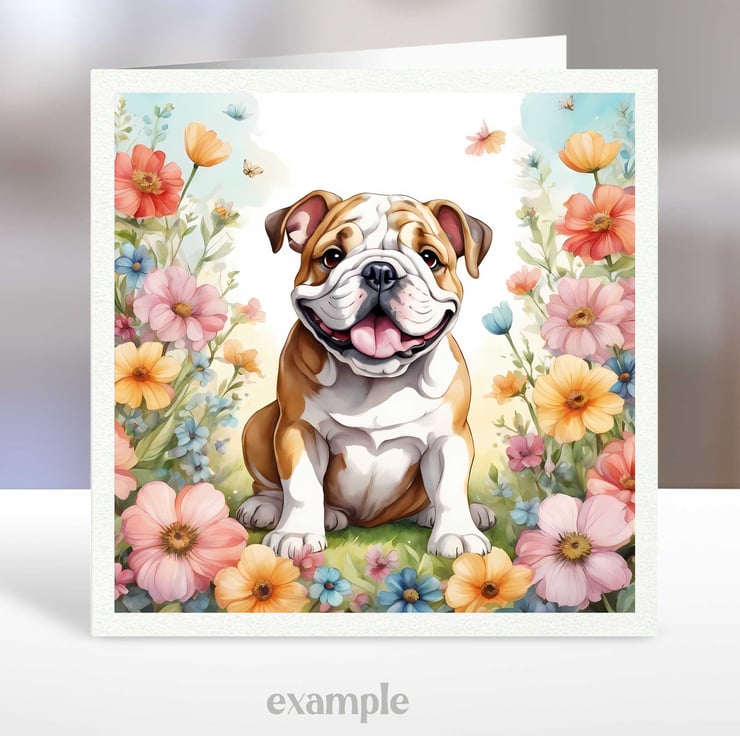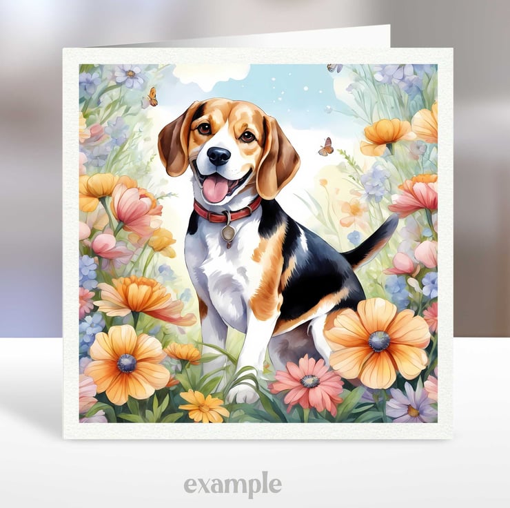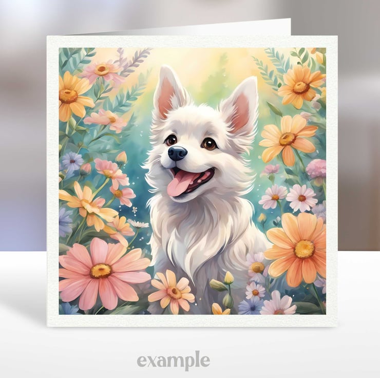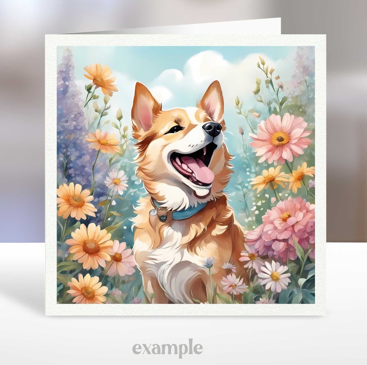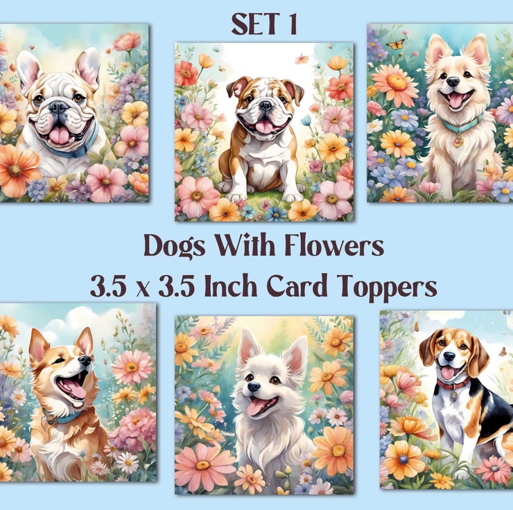 A set of six 3.5 inch square card toppers - Dogs with flowers - Set 1 of 4 - dogs surrounded by beautiful floral arrangements. Great for any occasion cards and note cards.