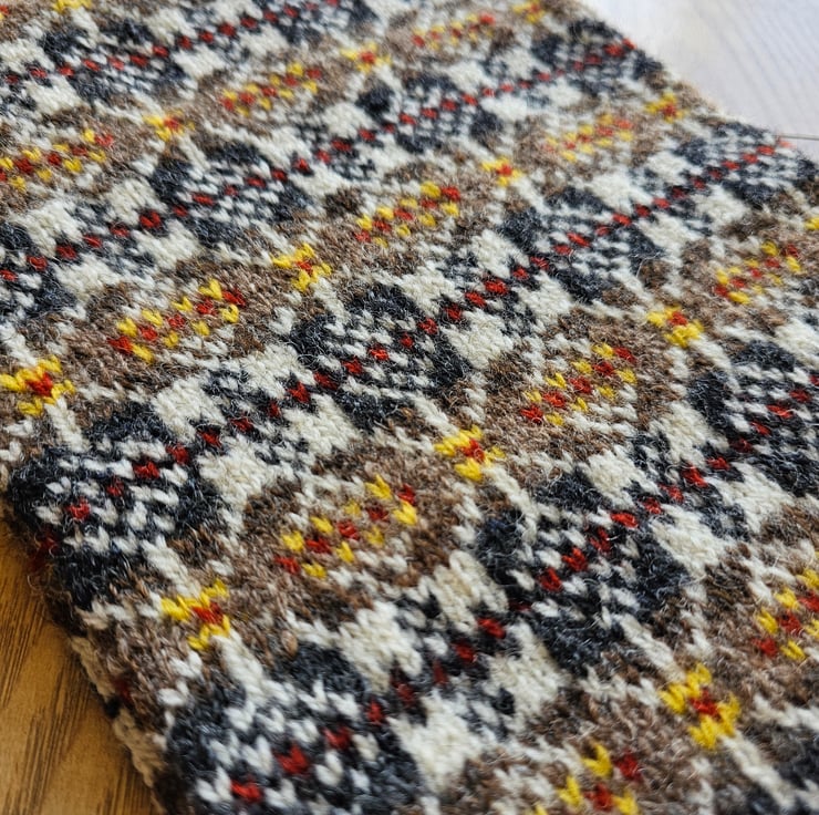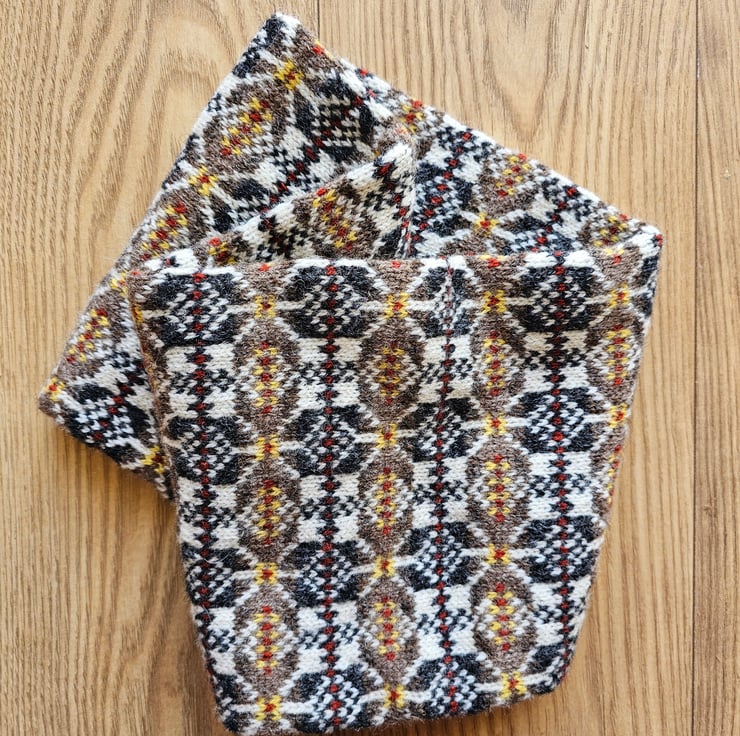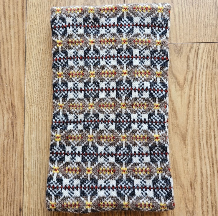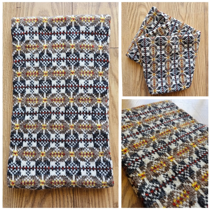 This cosy cowl has been hand knit using traditional Fair Isle/Nordic techniques and designs in Shetland wool. This is my "Thora Beth Star" design in warm natural shades of brown with accents of yellow and rust. The cowl is knit in a long tube with the ends stitched together meaning the finished item is double layered which provides extra protection from the winter chill.
