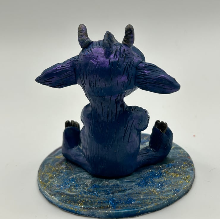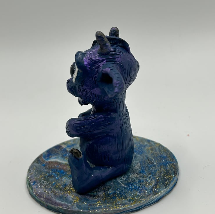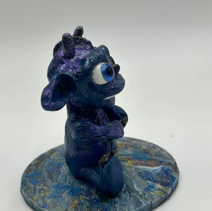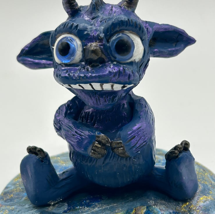 Hand-sculpted from polymer clay, this little guy is painted with acrylic paints for a unique and quirky look. With its horns, ears, and big eyes, it's sure to add a playful touch to your workspace.