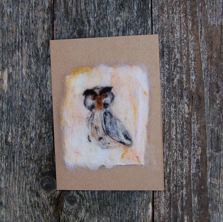 An Owl needle felted onto a piece of vintage wool blanketand lightly attached to a card.
