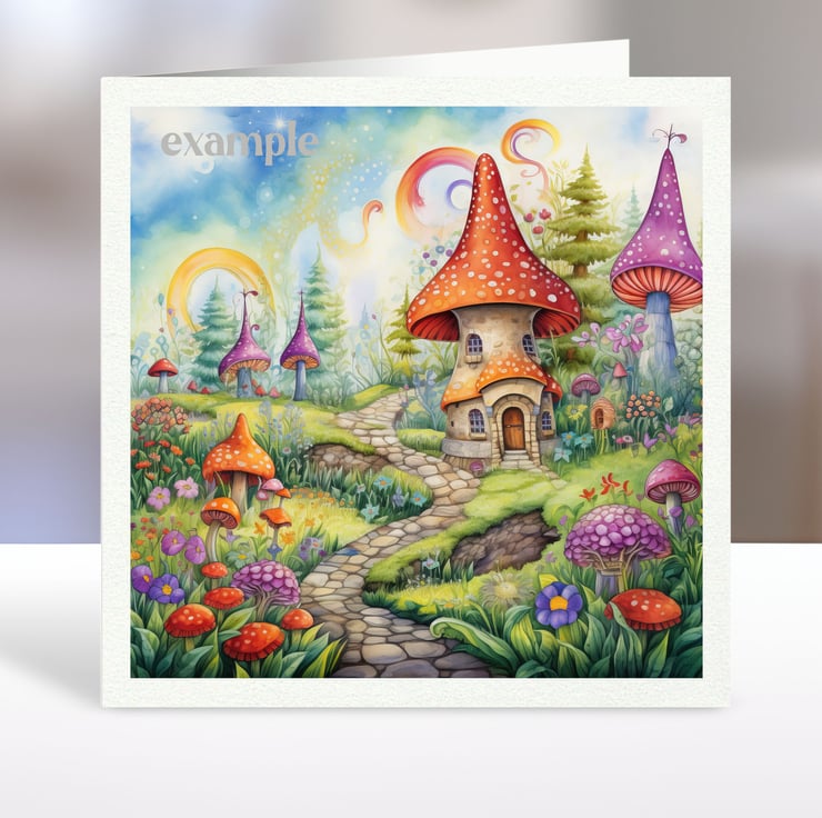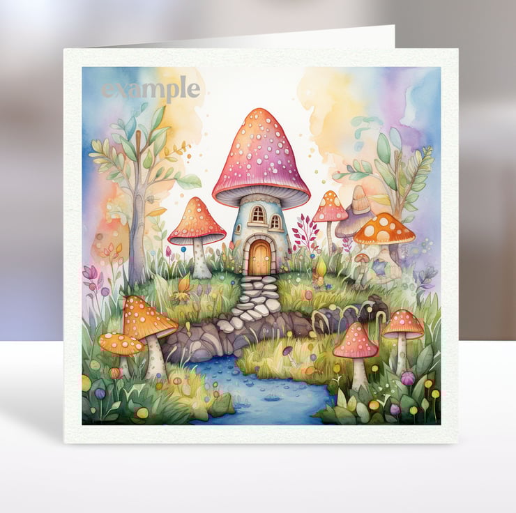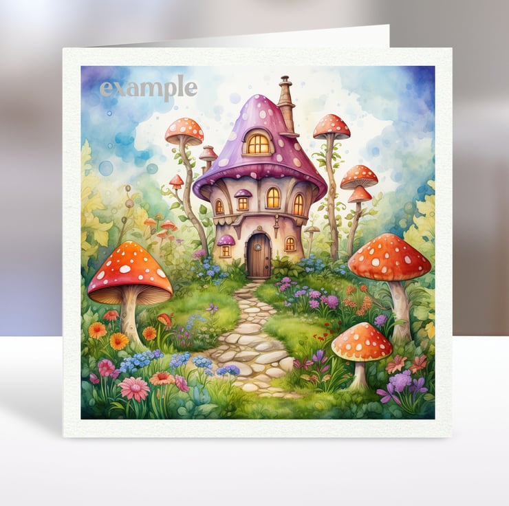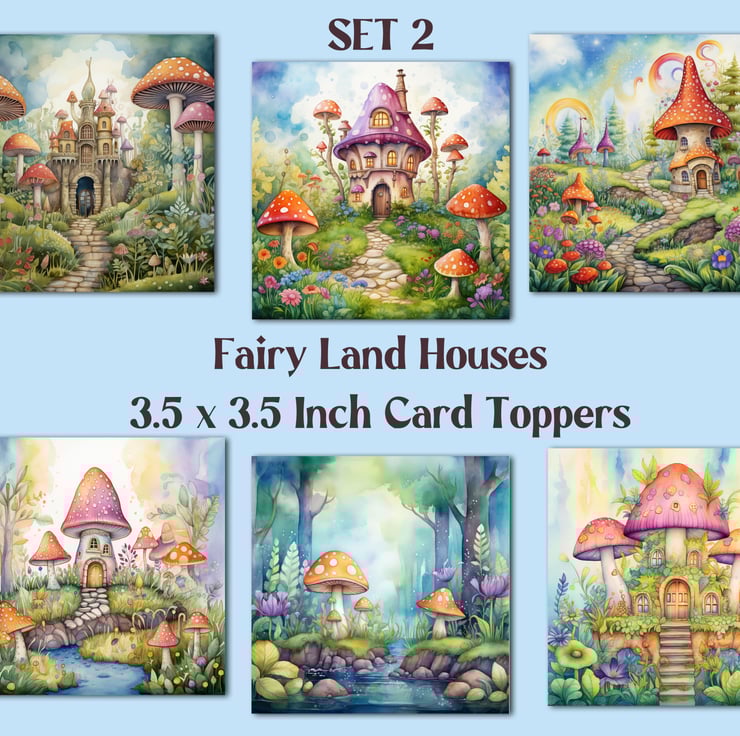 A set of six 3.5 inch square card toppers - Fairyland mushroom houses - Set 2 of 3 - for cards, note cards, tags, journal and scrapbook projects.