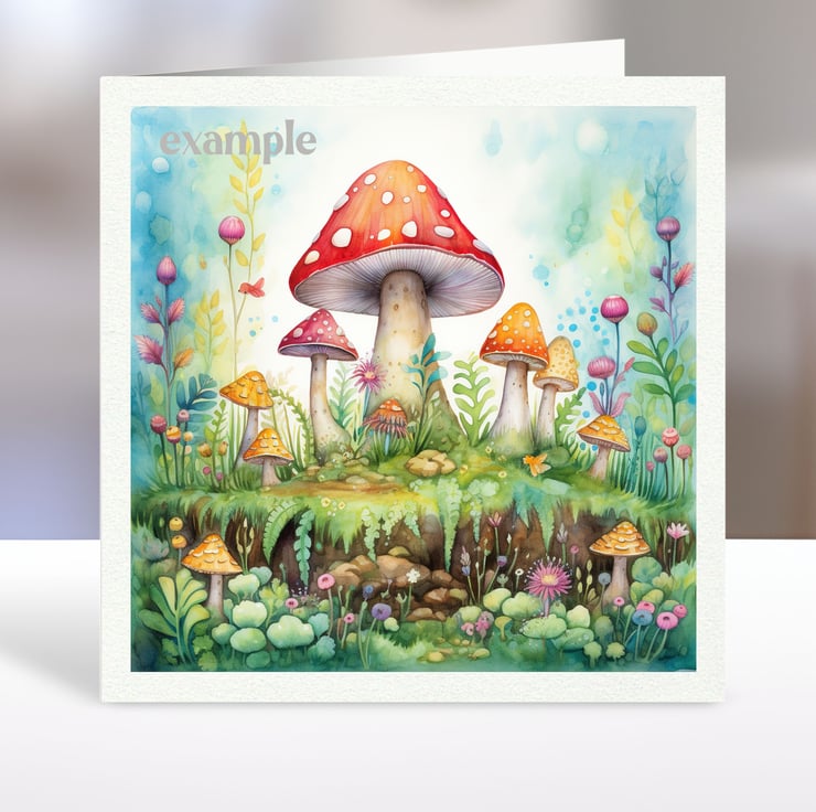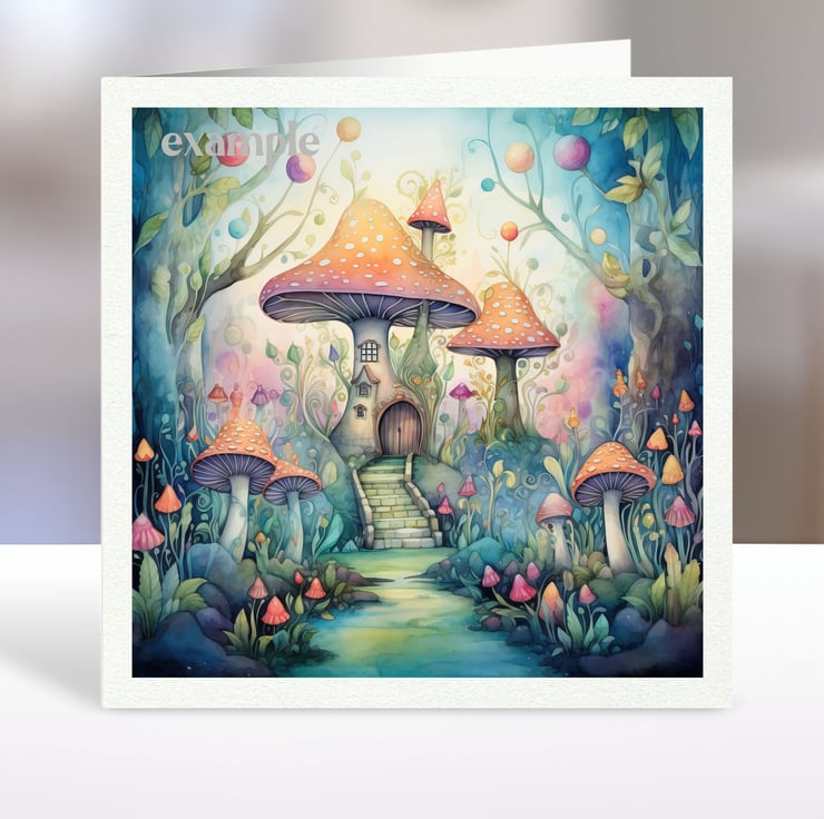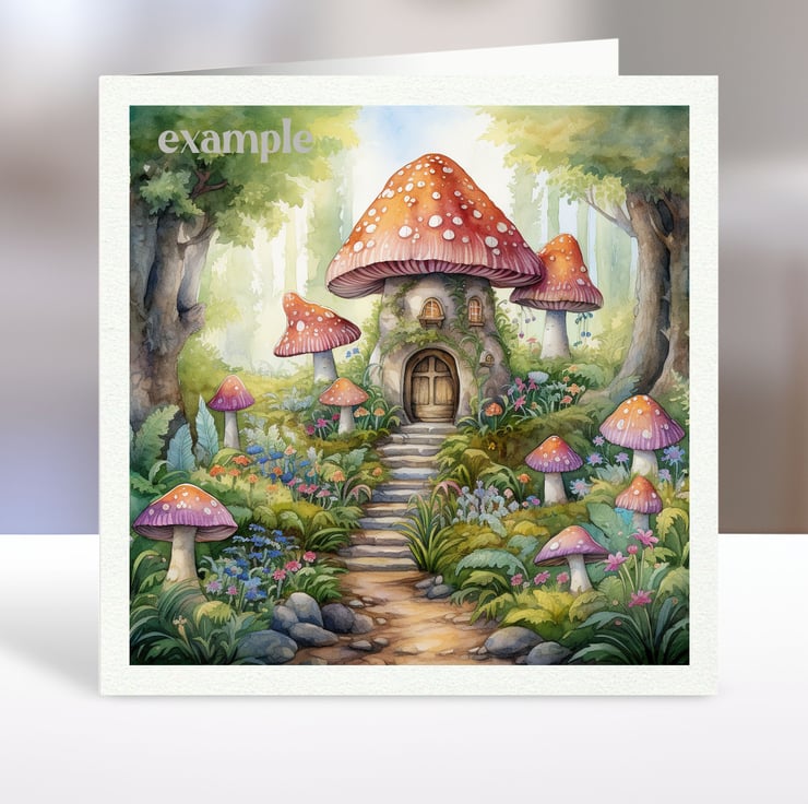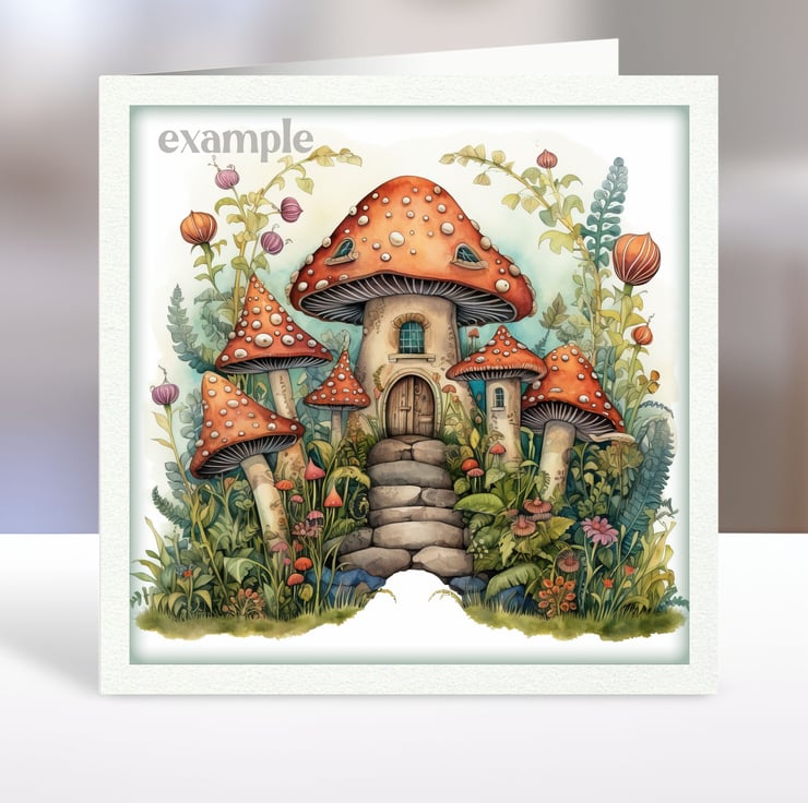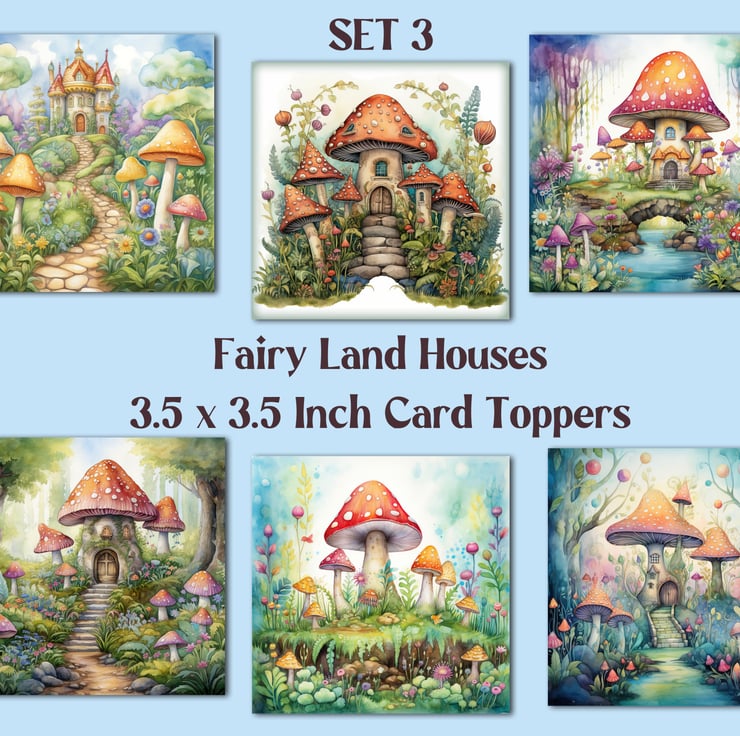 A set of six 3.5 inch square card toppers - Fairyland mushroom houses - Set 3 of 3 - for cards, note cards, tags, journal and scrapbook projects.