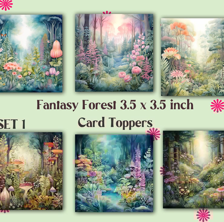 A set of six 3.5 inch square card toppers - Fantasy forest - Set 1 of 3 - for cards, note cards, tags, journal and scrapbook projects.