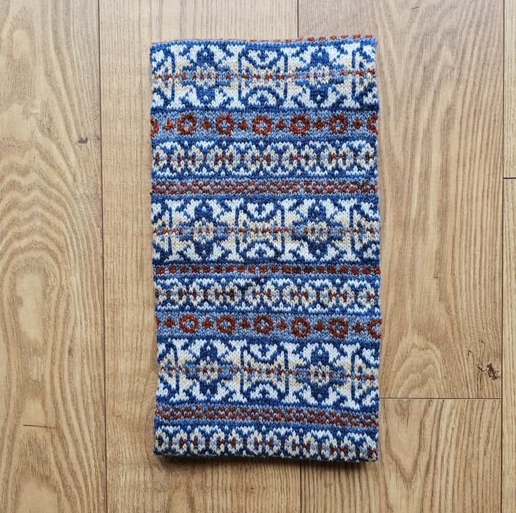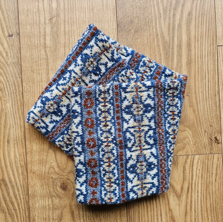 This cosy cowl has been hand knit using traditional Fair Isle/Nordic techniques and designs in Shetland wool. This is my "Hos'ick" design in shades of blue and rusty brown. The cowl is knit in a long tube with the ends stitched together meaning the finished item is double layered which provides extra protection from the winter chill.