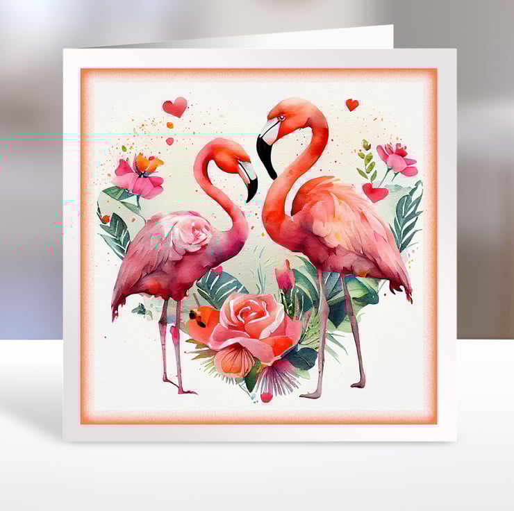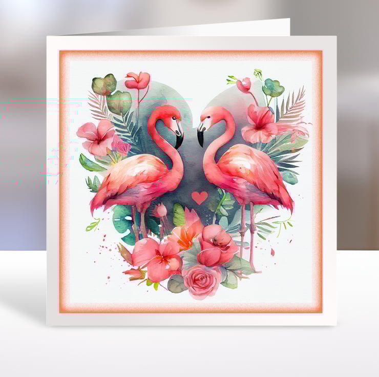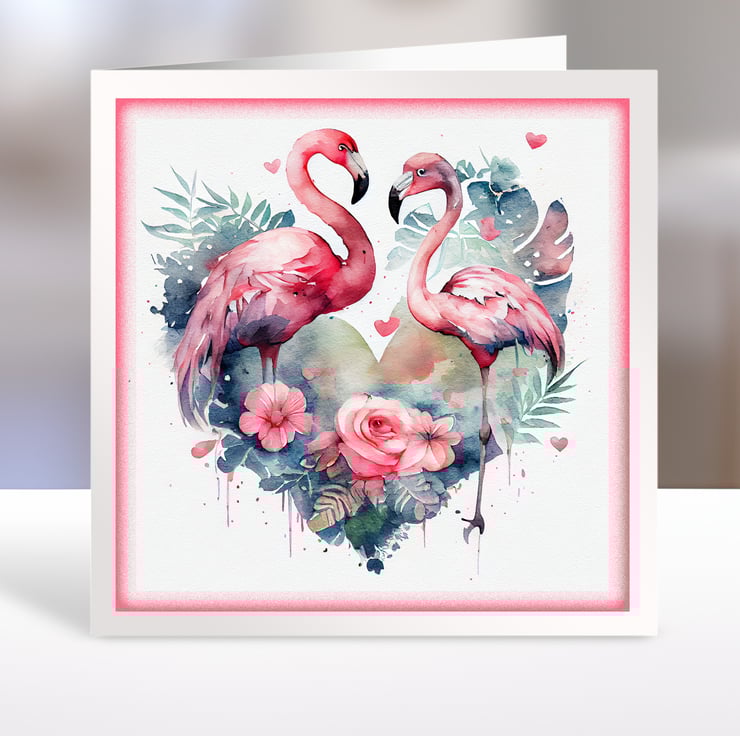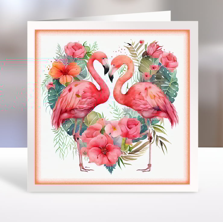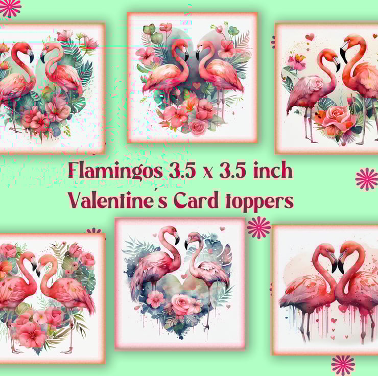 A set of six 3.5 inch square card toppers - Flamingos with heart shaped floral backgrounds, ideal for Valentine's cards, note cards, tags, journal and scrapbook projects.