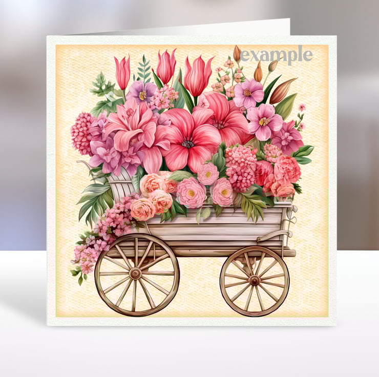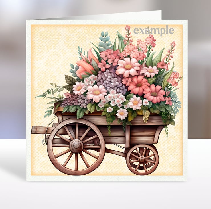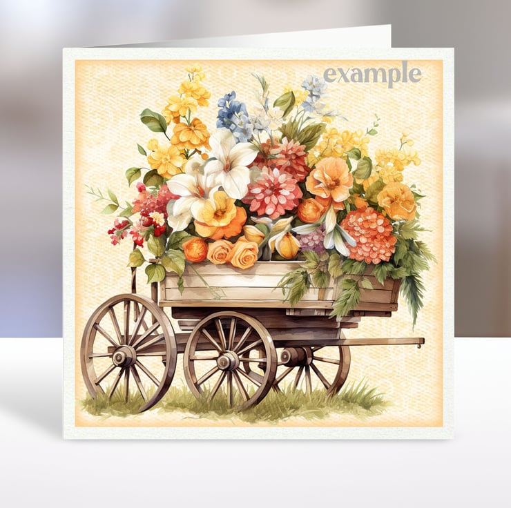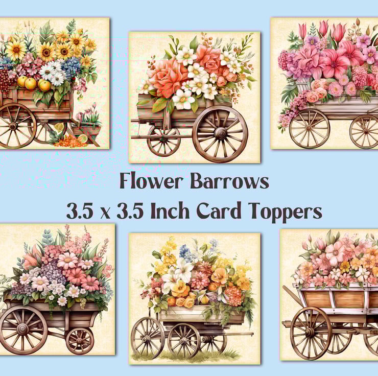 A set of six 3.5 inch square card toppers - Flower barrows - wooden barrows filled with beautiful flowers for cards, note cards, tags, journal and scrapbook projects.