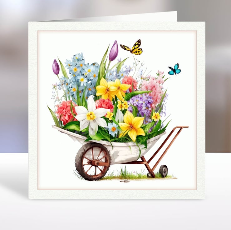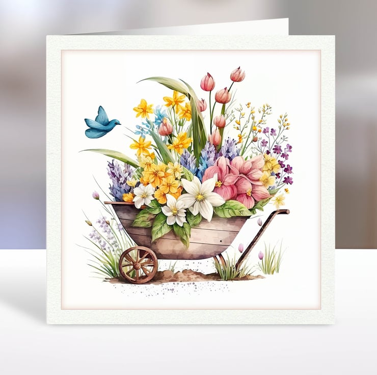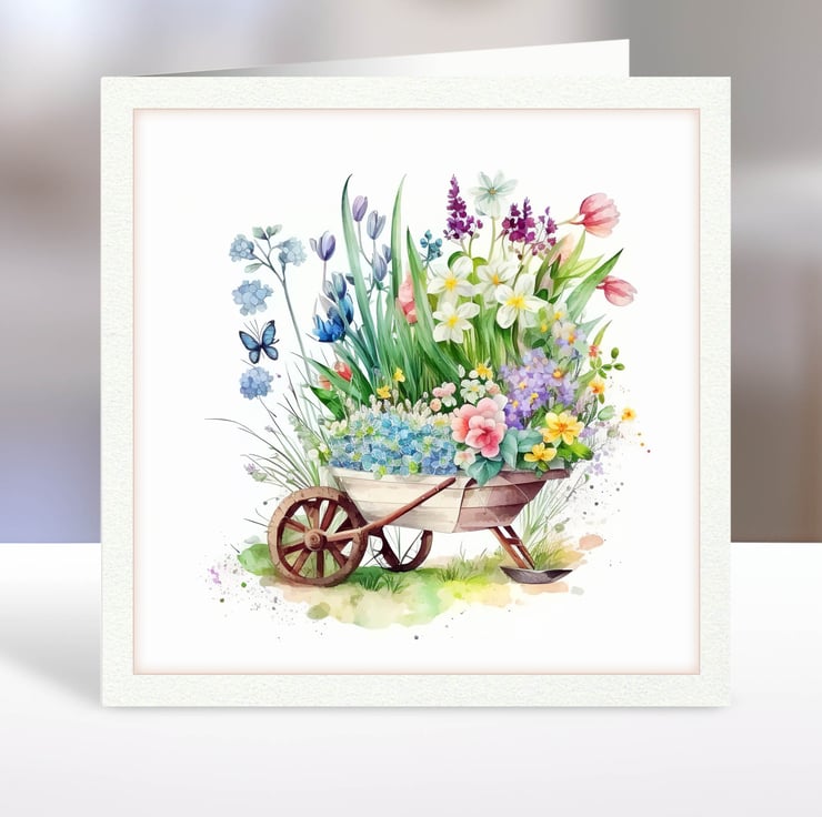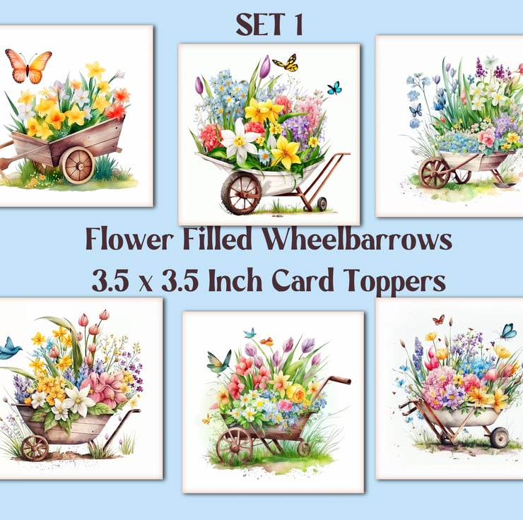 A set of six 3.5 inch square card toppers - Flower filled wheelbarrows - Set 1 of 2 - barrows filled with beautiful flowers for cards, note cards, tags, journal and scrapbook projects.