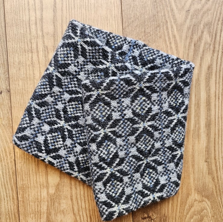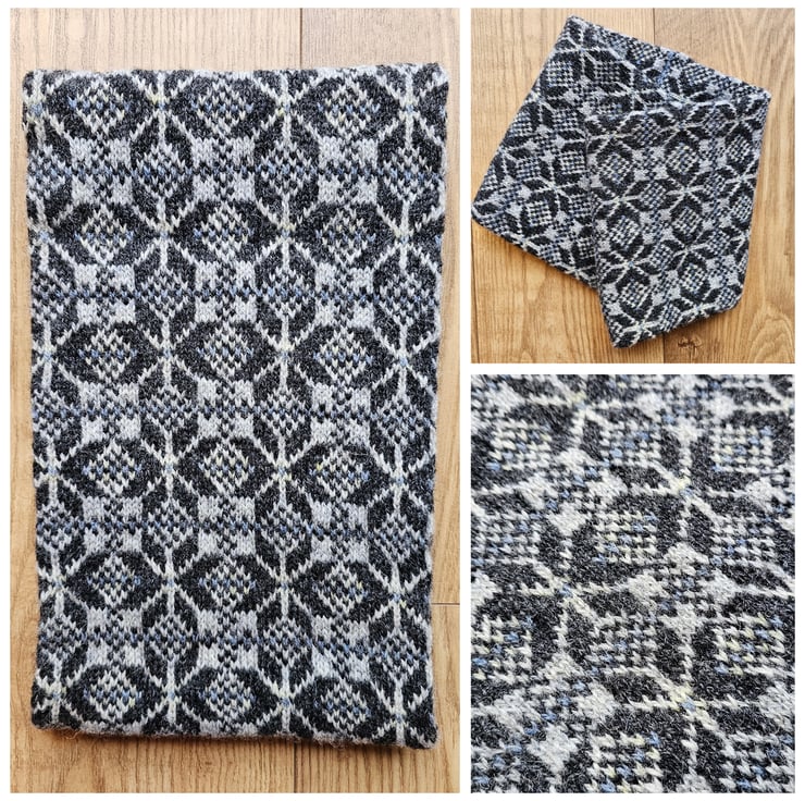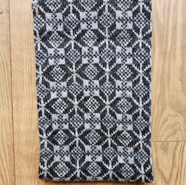 This cosy cowl has been hand knit using traditional Fair Isle/Nordic techniques and designs in Shetland wool. This is my "Thora Beth Star" design in dark and light grey with subtle accents of yellow and blue. The cowl is knit in a long tube with the ends stitched together meaning the finished item is double layered which provides extra protection from the winter chill.