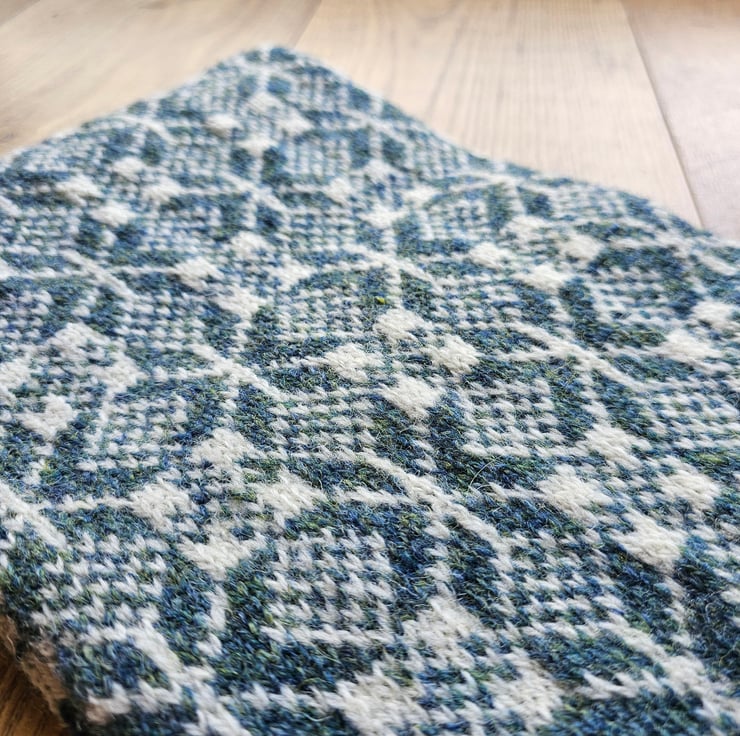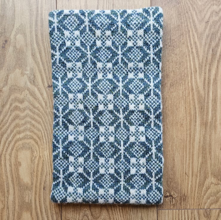 This cosy cowl has been hand knit using traditional Fair Isle/Nordic techniques and designs in Shetland wool. This is my "Thora Beth Star" design in green/blue with a background colour of white. The cowl is knit in a long tube with the ends stitched together meaning the finished item is double layered which provides extra protection from the winter chill.