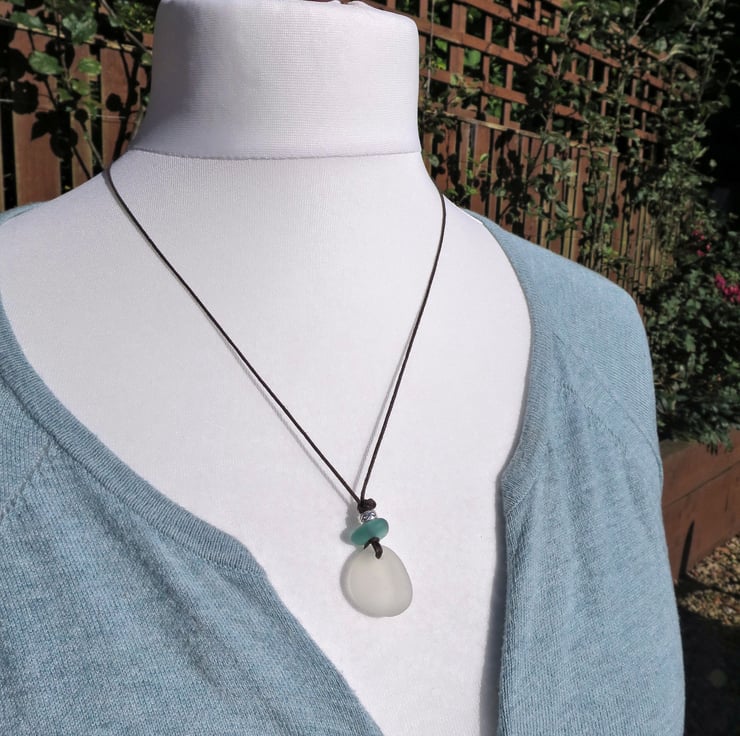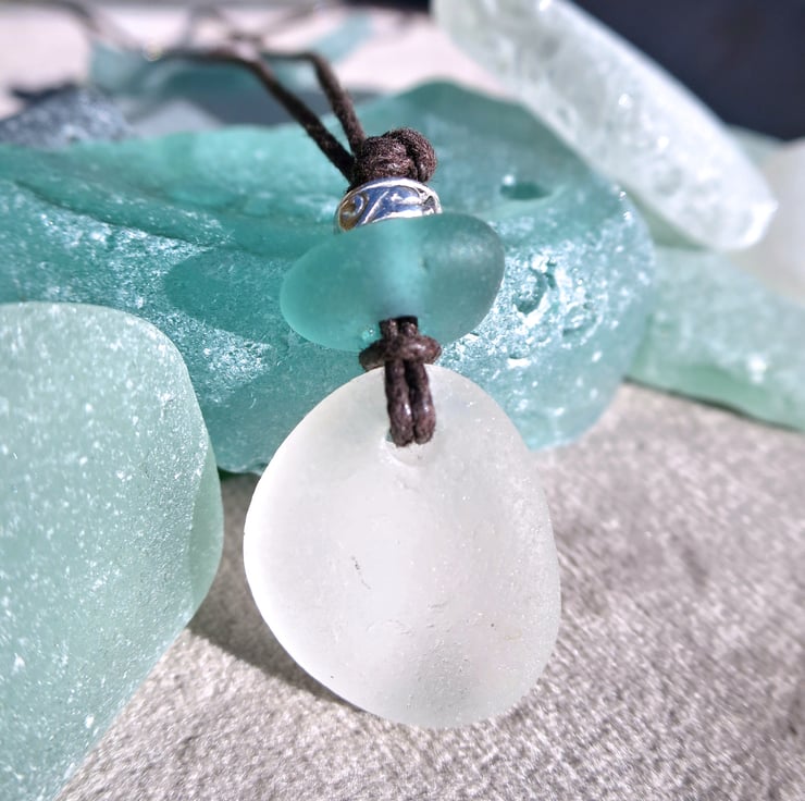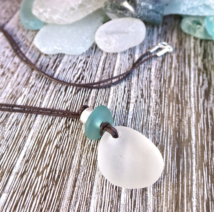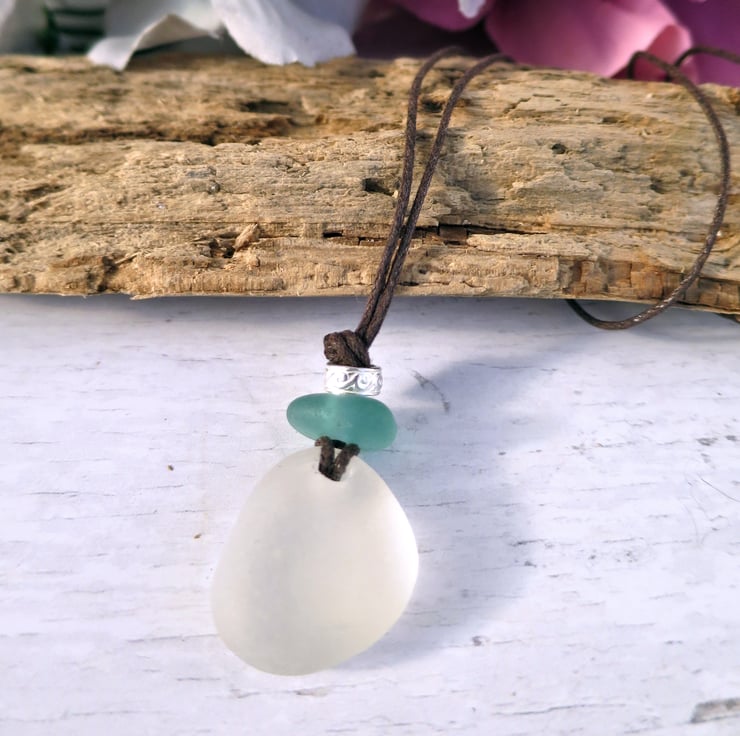 A white sea glass pendant with gently rounded edges, and with sterling silver accents and findings on a brown waxed cotton cord. The sea glass has been lightly oiled to highlight the natural colours and maintain its straight from the sea appearance. Handpicked by me from the beaches of east coast Scotland. Each piece bears the marks of its ocean journey, with small pits and marks making a unique sea jewel.