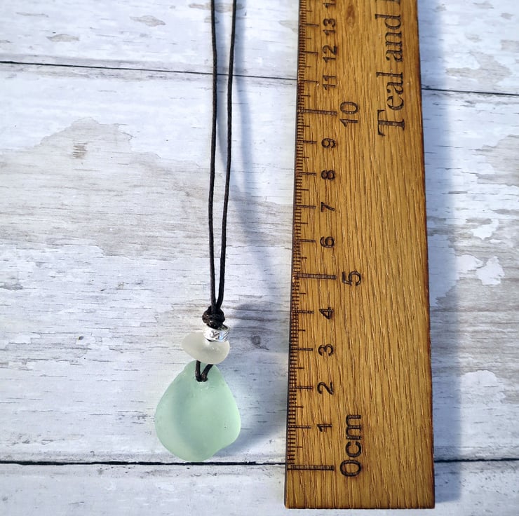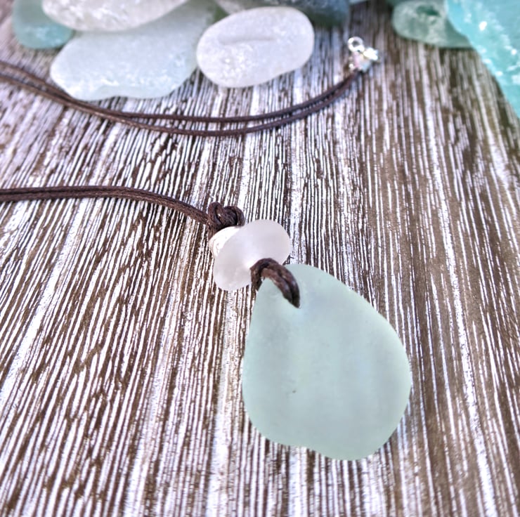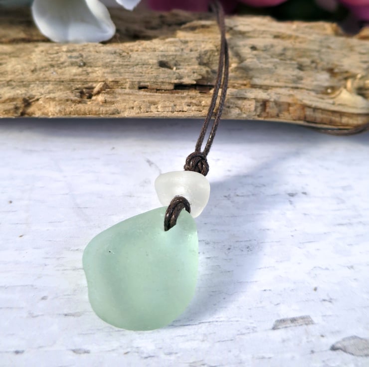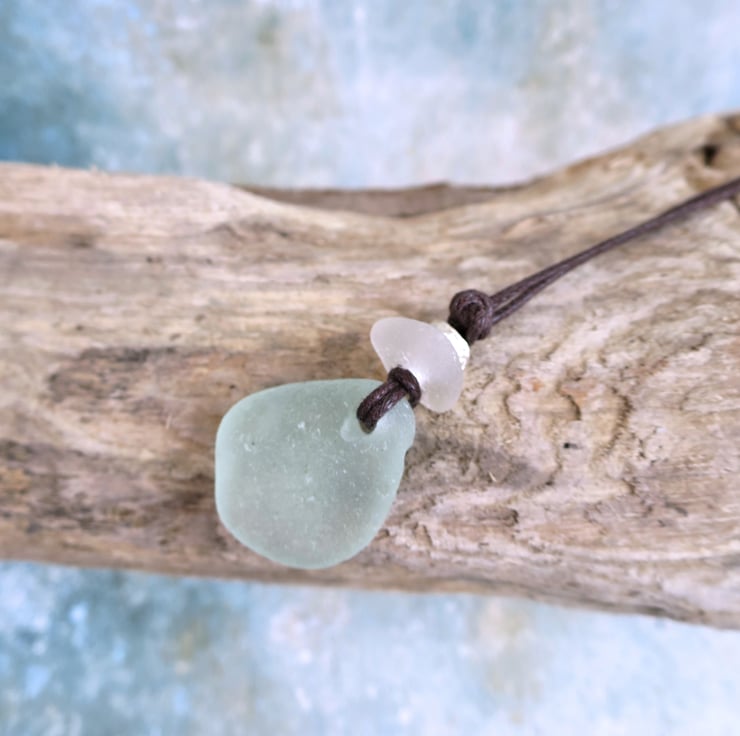 Seafoam and white sea glass unisex pendant with gently rounded edges, and with sterling silver accents and findings on a brown waxed cotton cord. The sea glass has been lightly oiled to highlight the natural colours and maintain its straight from the sea appearance. Handpicked by me from the beaches of east coast Scotland. Each piece bears the marks of its ocean journey, with small pits and marks making a unique sea jewel.
