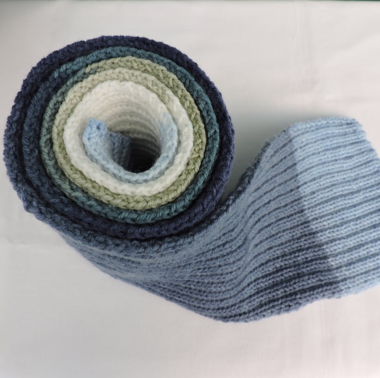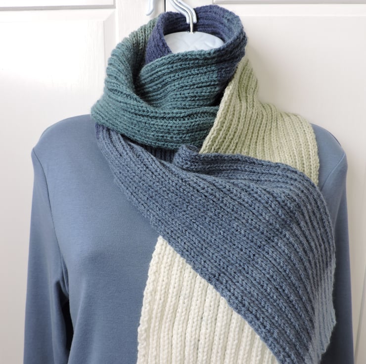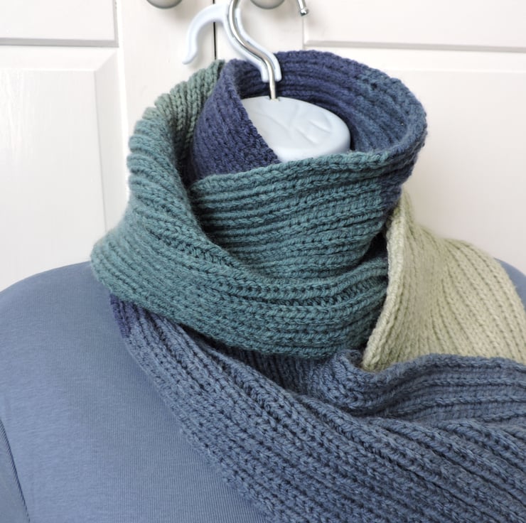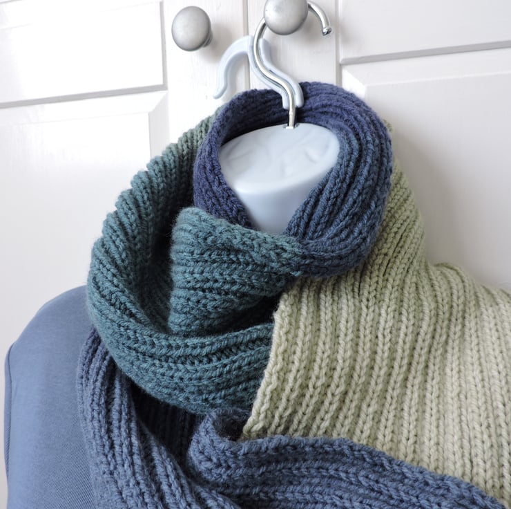 Sale This knitted scarf has been made with an Aran weight premium acrylic yarn. Knitted in a double rib pattern. Block colours of pale blue, air force blue, cream, pale green, sea green and navy blue. Ideal for male or female. A soft and cosy winter warmer to keep you snug in the colder weather.