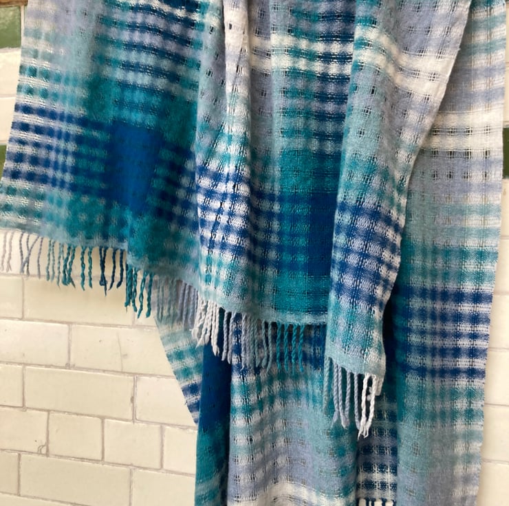 A super soft handwoven lambswool blanket in 8 shades of the sea. Woven in a simple crammed and spaced draft producing a light and airy blanket where each colour visually blends to create a gradient. Perfect as a throw for a special chair or laying over the foot of a bedThe colours are repeated in warp and weft, blending to create every shade in between. Inspired by the colour palette of the North Sea breaking on the harbour defences at Staithes.