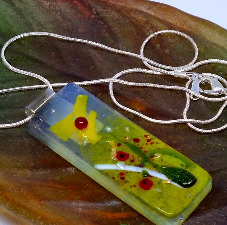 Fused glass pendants with a Poppy field scene for the background. This was made by fusing clear glass on opaline. Then, glass powders were added for the grass and sky. Followed by glass frits and stringers to represent the flowers and added details. Various coloured flowers were added in the background and then fully fused. These then had small glass elements added to form the flowers and foreground details and a little dichroic glass frit to give each piece a little lift. These were tack-fused to give each piece a 3D look. The finished pendant is 2cm x 5.5cm x 6mm and has a silver-plated bail and chain, which is 18 inches long. Due to the nature of fused glass, each piece is unique.
