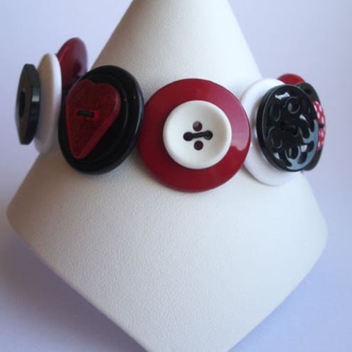This distinctive button bracelet is rich with an assortment of red, white and black buttons. These are threaded onto jewellery wire, which secures at the end with a silver plated lobster clasp fastener.