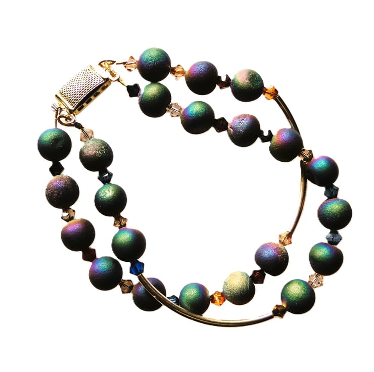 2 strand bracelet with multi-coloured Beads and Swarovski crystals. Gold coloured links and push clasp. The druzys and crystals sparkle. It matches the 2 string necklace on my site. There are also a selection of earrings that match.Sets can be ordered on the necklace page at a reduced price.