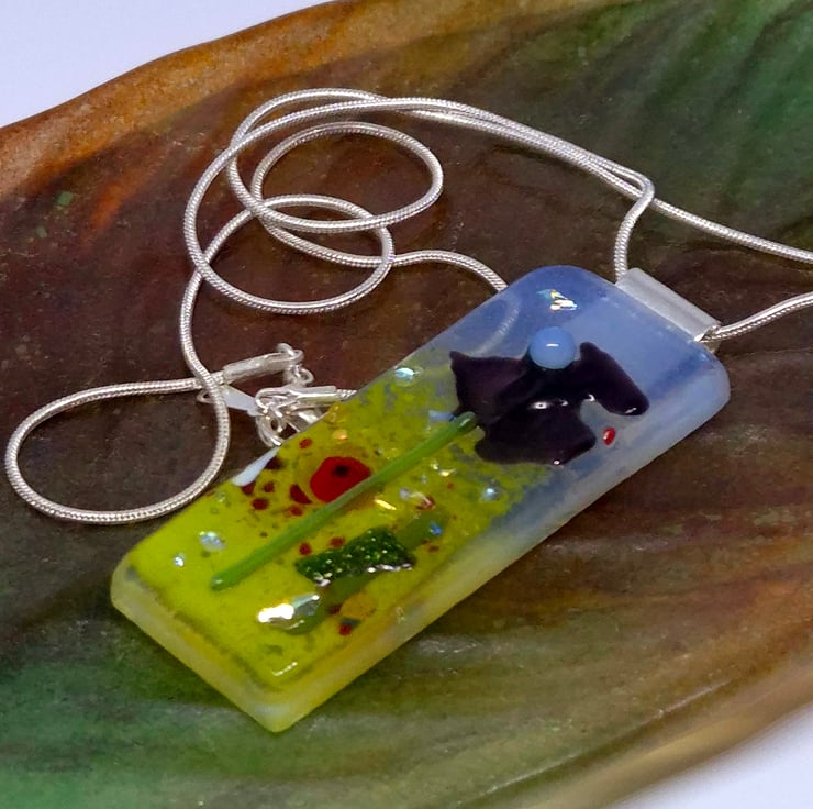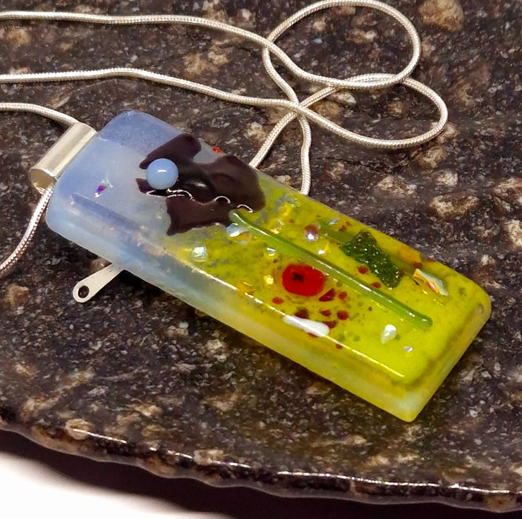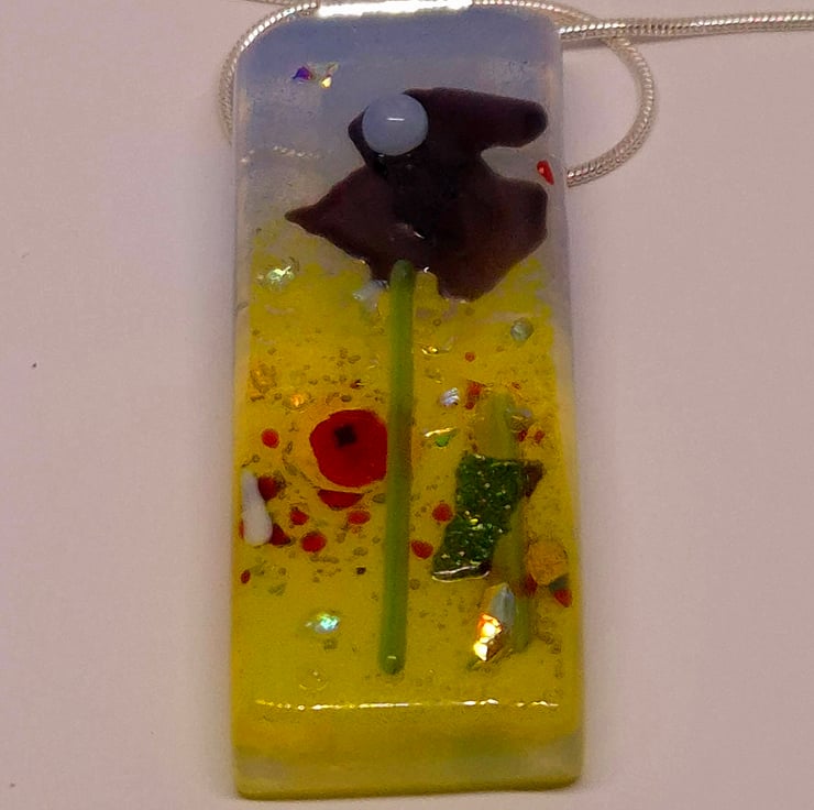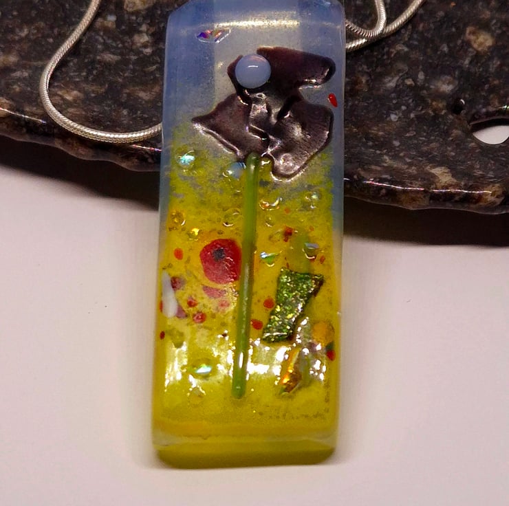 Fused glass pendants with a Poppy field scene for the background. This was made by fusing clear glass on opaline. Then, glass powders were added for the grass and sky. Followed by glass frits and stringers to represent the flowers and added details. Various coloured flowers were added in the background and then fully fused. These then had small glass elements added to form the flowers and foreground details and a little dichroic glass frit to give each piece a little lift. These were tack-fused to give each piece a 3D look. The finished pendant is 2cm x 5.5cm x 6mm and has a silver-plated bail and chain, which is 18 inches long. Due to the nature of fused glass, each piece is unique.