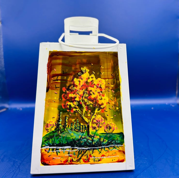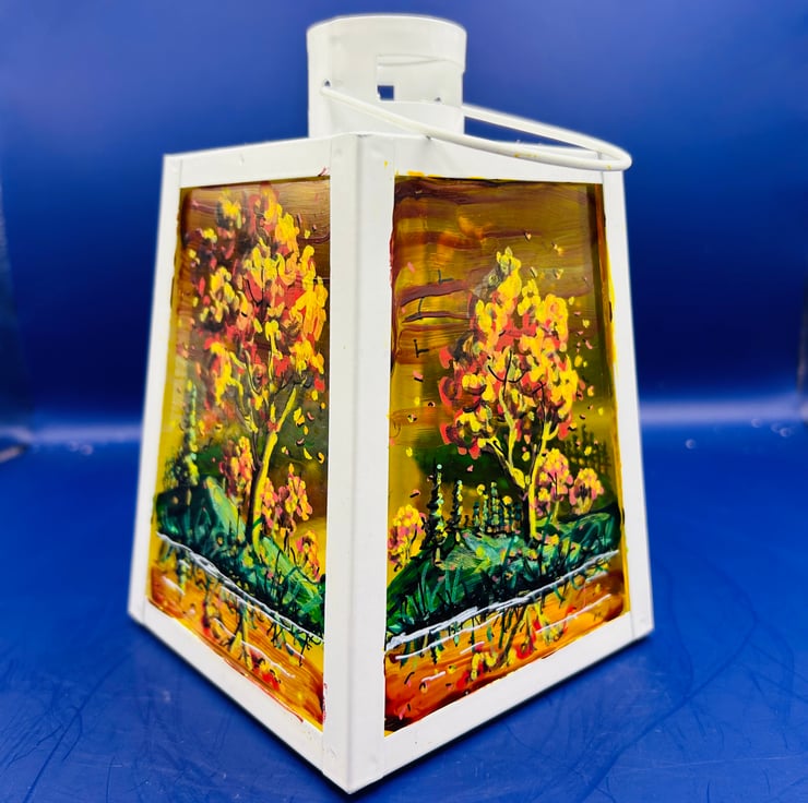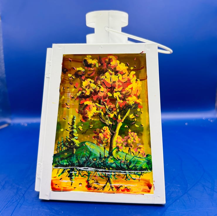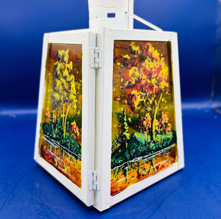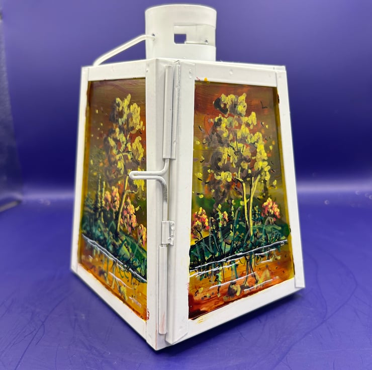 A hand painted and fired metal and glass lantern by Andrew Jenkins