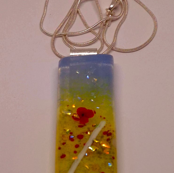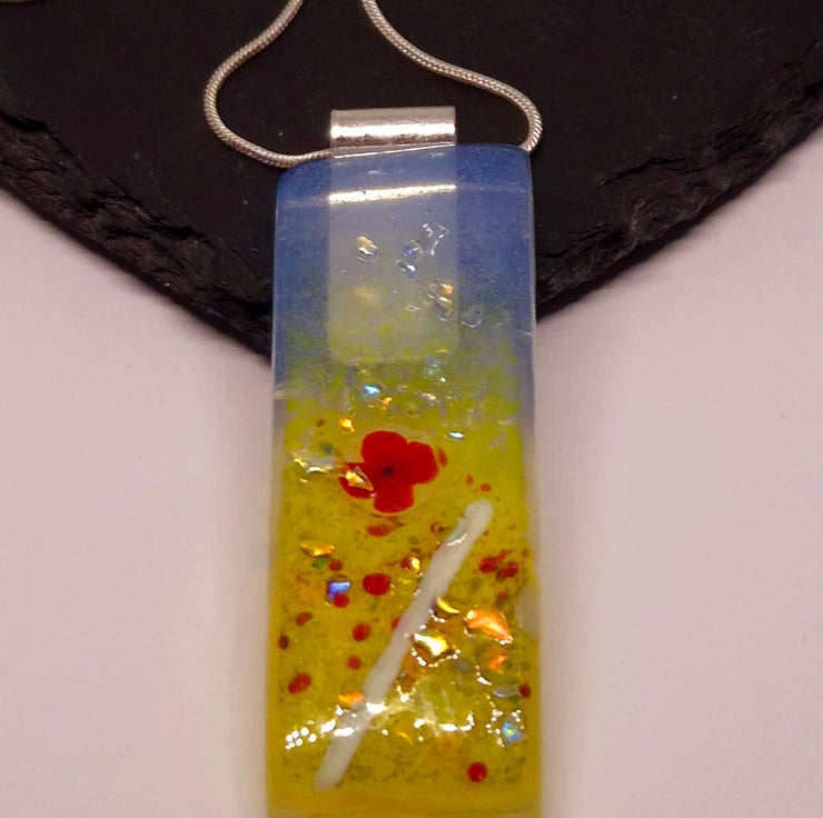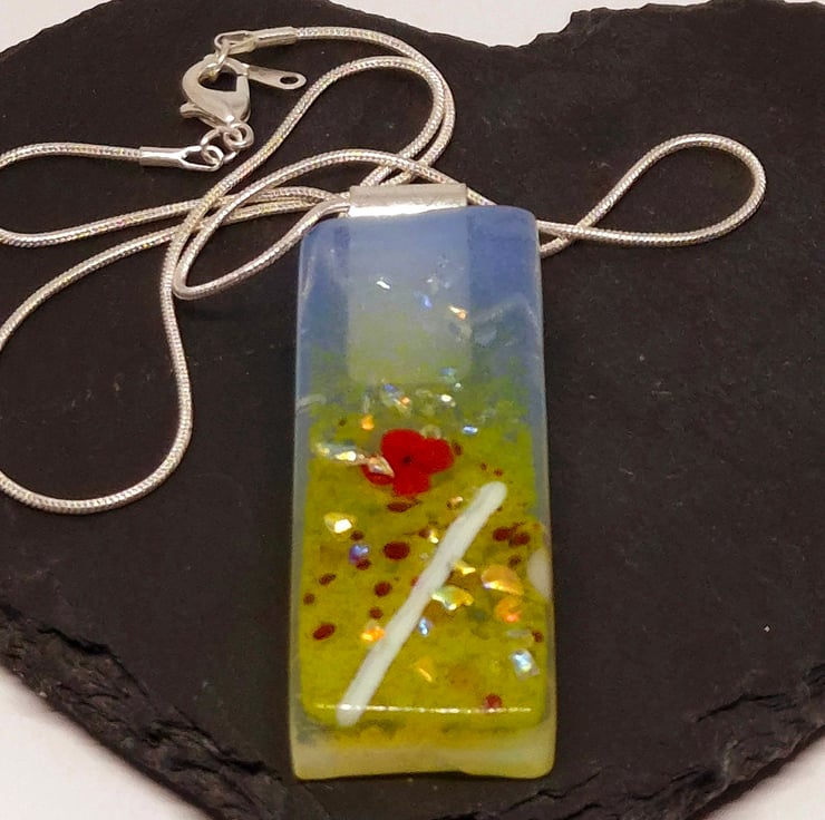 Fused glass pendants with a Poppy field scene for the background. This was made by fusing clear glass on opaline. Then, glass powders were added for the grass and sky. Followed by glass frits and stringers to represent the flowers and added details. Various coloured flowers were added in the background and then fully fused. These then had small glass elements added to form the flowers and foreground details and a little dichroic glass frit to give each piece a little lift. These were tack-fused to give each piece a 3D look. The finished pendant is 2cm x 5.5cm x 6mm and has a silver-plated bail and chain, which is 18 inches long. Due to the nature of fused glass, each piece is unique.