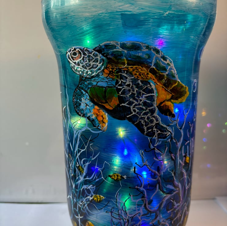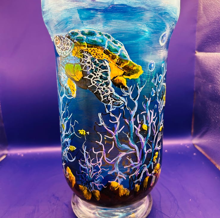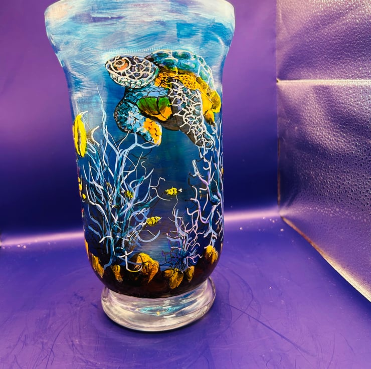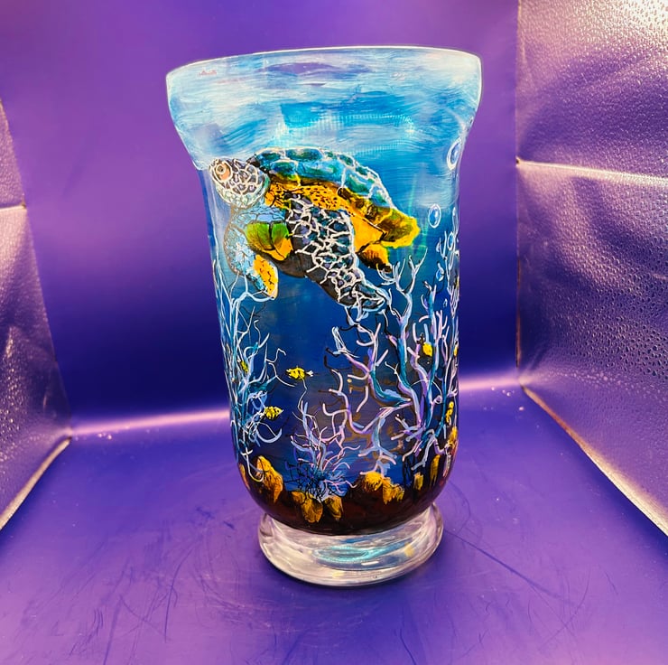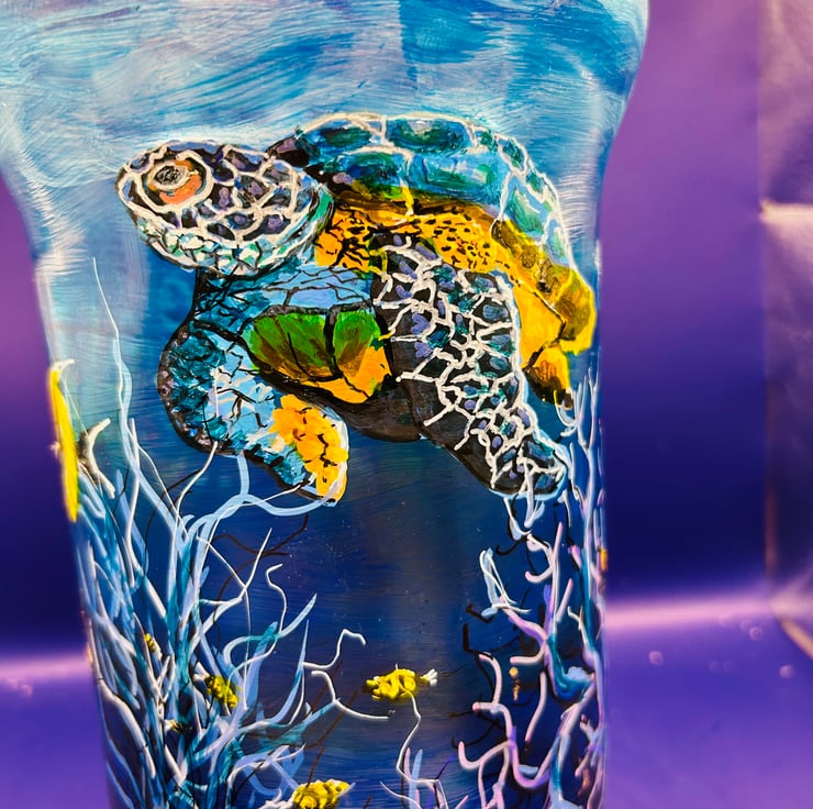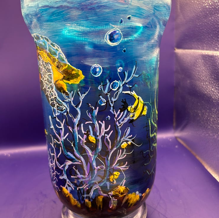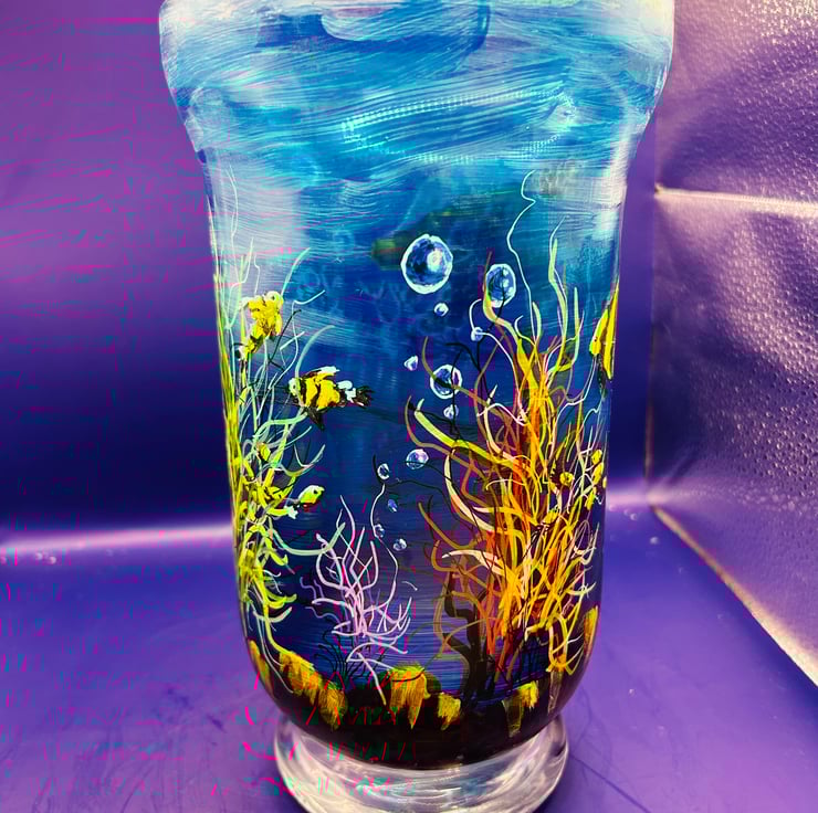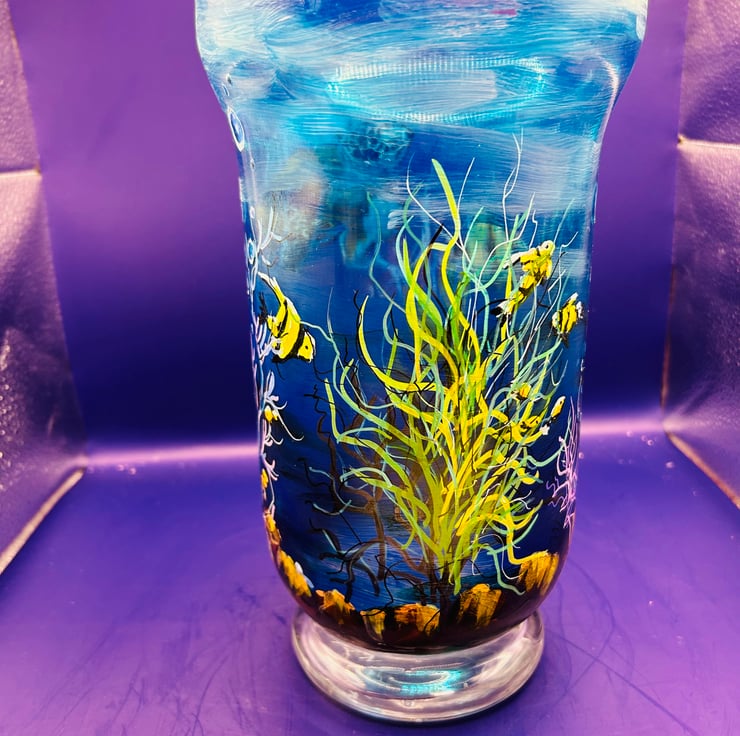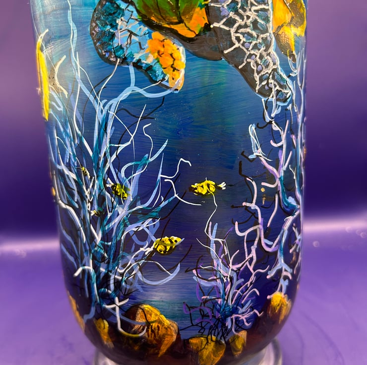 A hand painted and fired glass sea life vase by Andrew Jenkins