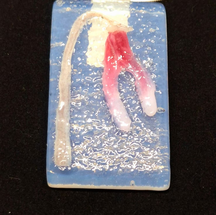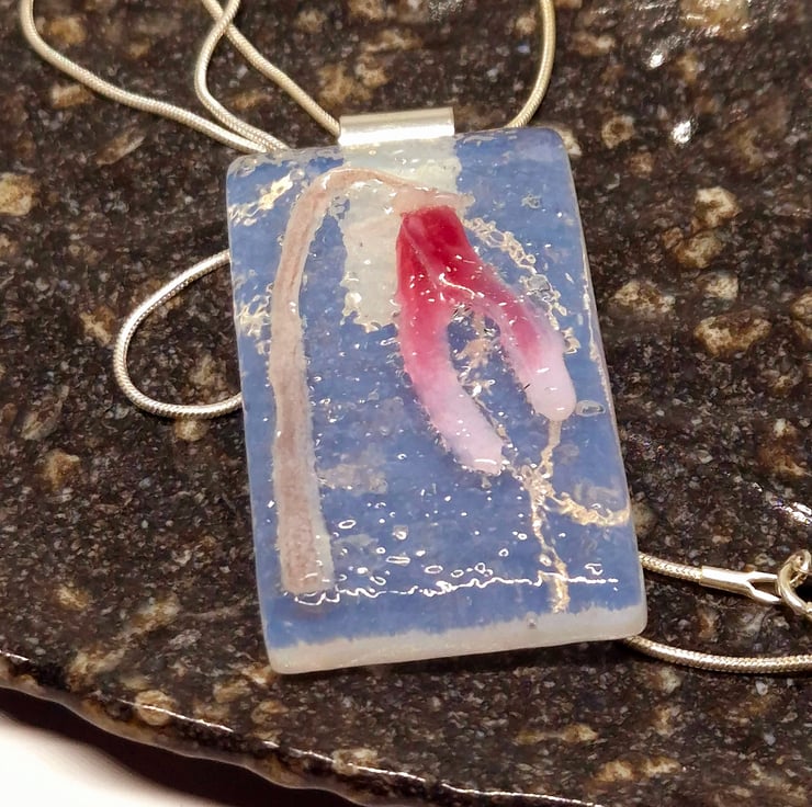 Fused glass pendants with botanical themes were made by fusing clear glass on opaline to make the base of the pendant. Hand-cut templates were used to form the part of each flower by sifting glass powders onto a kiln shelve through the templates and firing. This gave fragile, delicate wafers of glass. Next, the different sections of the flowers were again fired together to make a complete flower. These were tack-fused with a sprinkling of iridescent frit to give each piece a 3D look onto the base of the pendant. The finished pendant is 3cm x 5cm x 6mm and has a silver-plated bail and chain, which is 18 inches long. Due to the nature of fused glass, each piece is unique.
