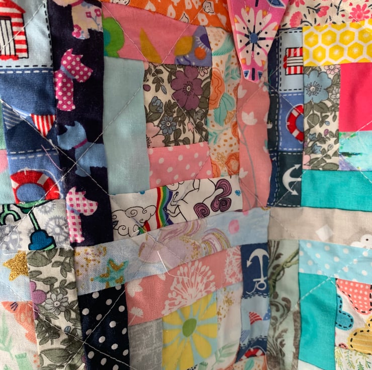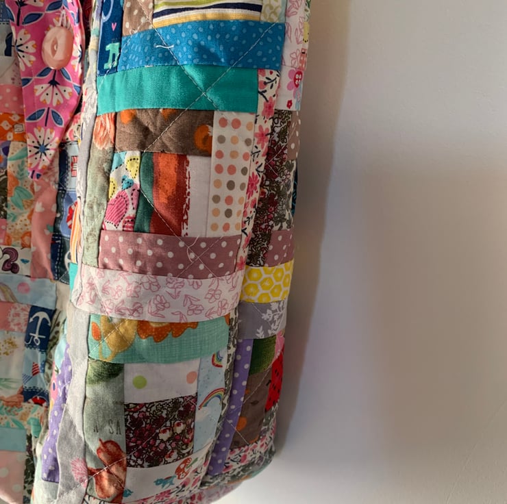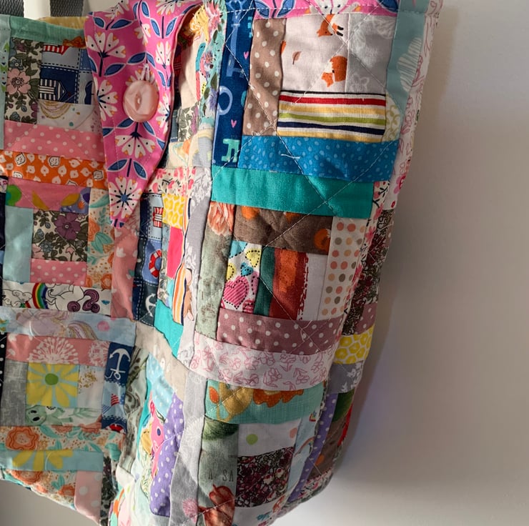 This extra large 17x14 inch log cabin patchwork quilted tote bag has a box bottom for even more room. It comes with a funky yellow lining and unique button fastening. The soft canvas handles make it comfy to carry on your shoulder.