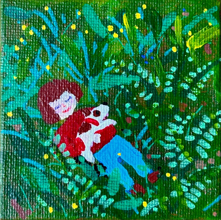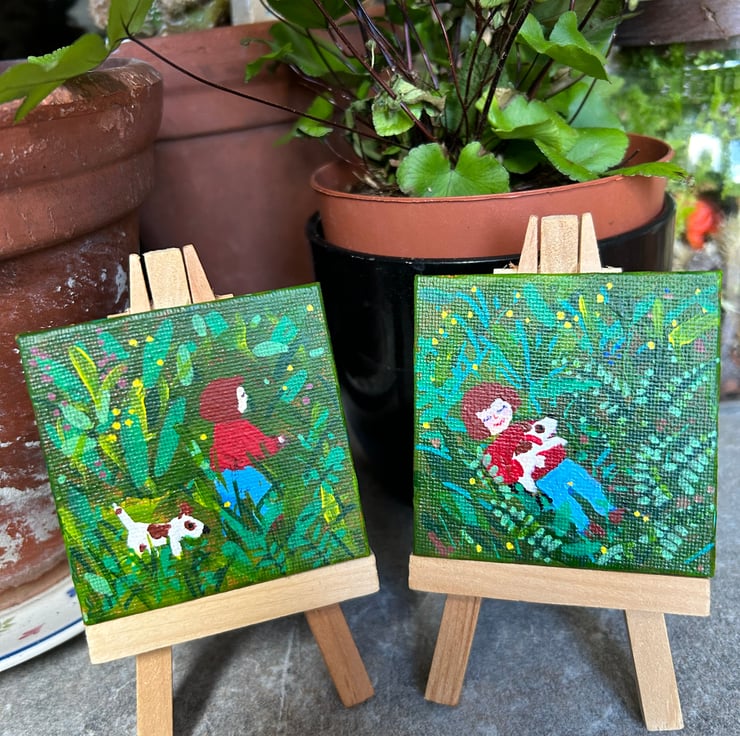 Part of a series of Small paintings of small child and their little dog. I love to paint these little paintings. Although they are small they pack a punch with colour and would make a lovely gift. They are one off paintings designed and produced by me in my garden studio.