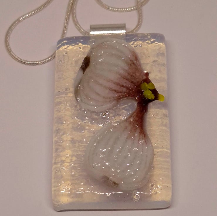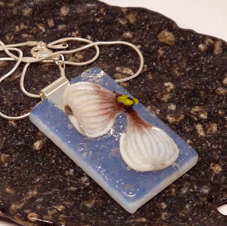 Fused glass pendants with botanical themes were made by fusing clear glass on opaline to make the base of the pendant. Hand-cut templates were used to form the part of each flower by sifting glass powders onto a kiln shelve through the templates and firing. This gave fragile, delicate wafers of glass. Next, the different sections of the flowers were again fired together to make a complete flower. These were tack-fused with a sprinkling of iridescent frit to give each piece a 3D look onto the base of the pendant. The finished pendant is 3cm x 5cm x 6mm and has a silver-plated bail and chain, which is 18 inches long. Due to the nature of fused glass, each piece is unique.